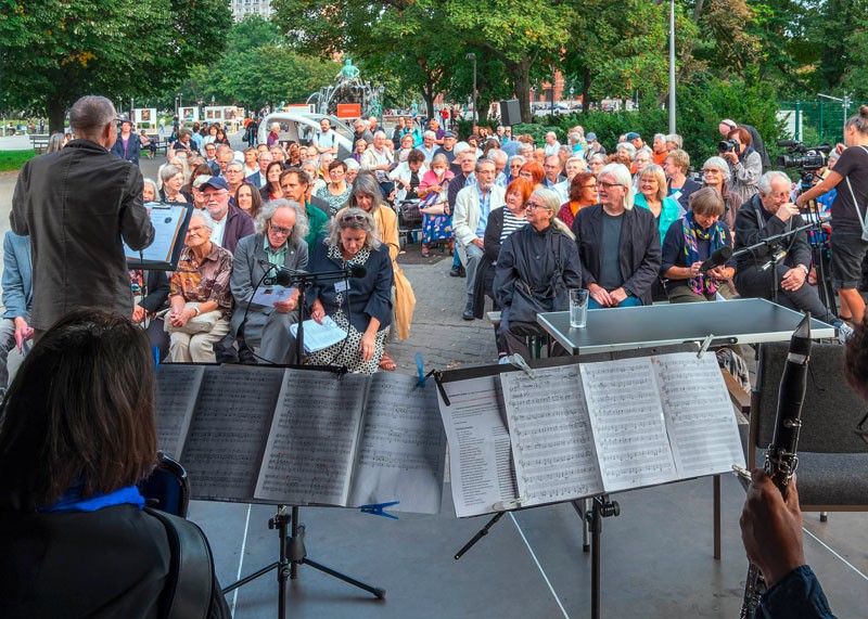 Am Dienstag 6.9. der dritte Reunion-Tag am Datum des Geburtstages von Moses Mendelssohn trafen sich alle Familienmitglieder zum historischen Gruppenfoto am Grab Moses Mendelssohns auf dem Jüdischen Friedhof Große Hamburger Straße. Um 18 Uhr fand am Ort des Mendelssohn-Wohnhauses, bei Micha Ullmans Bodendenkmal „Haus Mendelssohn“, der Geburtstags-Jourfixe „Unsterbliches“ (III) statt: Burghart Klaußner las zum Thema „Schönheit lieben“ Texte von Moses Mendelssohn, das Duo Klariac begleitete die Musik – zum Abschluß mit „Bei mir bist du schön“.