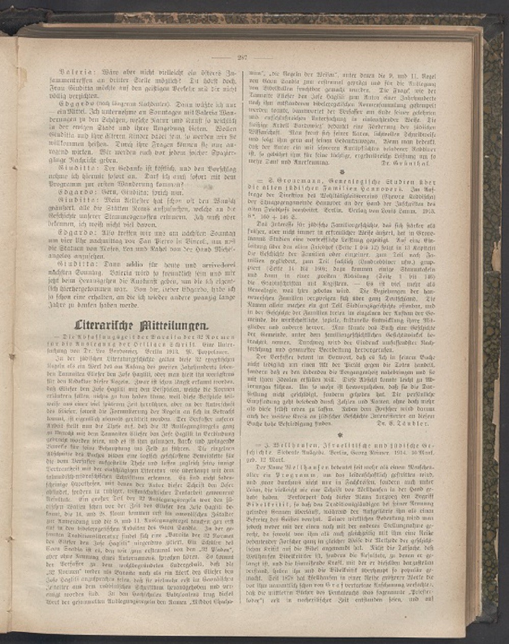 ... diese grundlage ein ganz neues Bild von der religiösen Entwicklung Israels gezeichnet. Zur Beurteilung dieser Schriften gehört natürlich eine umfassende wissenschaftliche Bildung, die nur der fachmann besitzen kann, und Wellhausen hat daher gut daran getan, schon 1894 neben denselben eine „Israelitische und jüdische Geschichte“ zu veröffentlichen, in der er ohne jedes gelehrte Beiwerk eine auch für gebildete Laien verständliche Darstellg von der geschichte und religil des Volkes Israel bis zur Zerstörung des zweiten tempels gibt. Dieses soeben in siebenter Auflage erschienene Werk muß wegen seines Ideenreichtums, seiner Wärme und last not lest seiner glänzenden darstellung einem jeden leser bewunderung einflößen, auch wenn er auf dem Boden ganz anderer Anschauungen steht.manche Stellen, namentlich in Kap. 15: „ Die jüdische Frömmigkeit“, gehören zu dem Schönsten und besten, was überhaupt über das Judentum je gesagt wurde.Am stärksten befremdet wird sich der jüdische leser, gleichviel welcher religiösen Richtung er angehört, vom letzten Kapitel fühlen, das über „Das Evangelium“ spricht. Bezeichnenderweise trägt dasselbe den Vermerk: Ich habe dieses Kapitel stehen lassen, obgleich ich nur noch teilweise damit einverstanden bin.“ also auch für diesen großen kritiker, der um seines Wahrheitsmutes willen einst aus der theologischen Fakultät in die philosophische gedrängt wurde, gibt es grenzen über die hinaus er seine Kritik nicht ausdehnen will. Ist das nicht lehrreich und zugleich eine Rechtfertigung für die zahlreicheen Juden, die trotz ihres Freisinns jeder Bibelkritik mißtrauisch oder gar ablehnend gegenüberstehen?