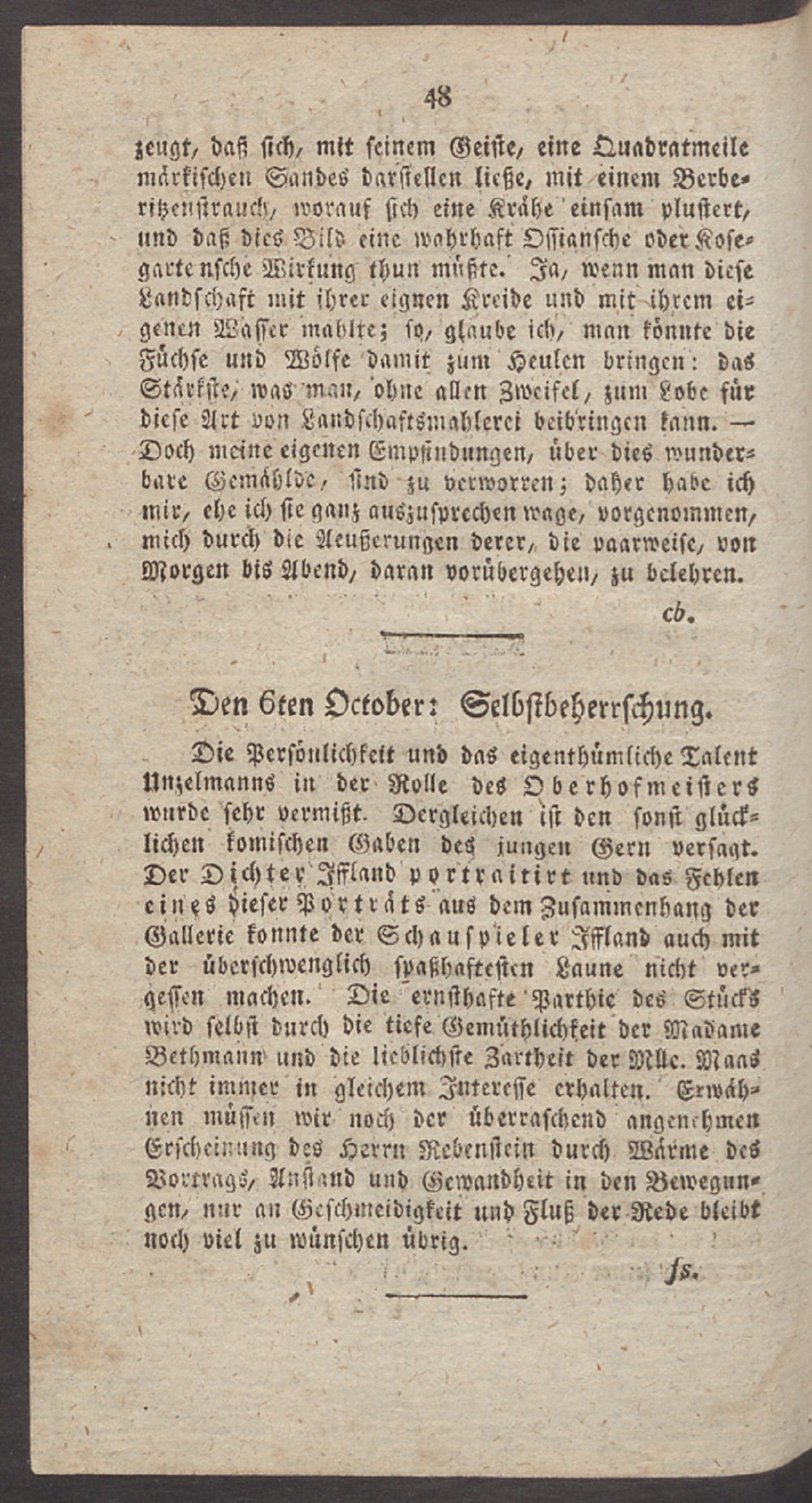 Die Persönlichkeit und das eigenthümliche Talent Unzelmanns in der Rolle des Oberhofmeisters wurde sehr vermißt. Dergleichen ist den sonst glücklichen komischen Gaben des jungen Gern versagt. Der Dichter Iffland portraitirt und das Fehlen eines dieser Porträts aus dem Zusammenhang der Gallerie konnte der Schauspieler Iffland auch mit der überschwenglich spaßhaftesten Laune nicht vergessen machen. Die ernsthafte Parthie des Stücks wird selbst durch die tiefe Gemüthlichkeit der Madame Bethmann und die lieblichste Zartheit der Mlle. Maas nicht immer in gleichem Interesse erhalten. Erwähnen müssen wir noch der überraschend angenehmen Erscheinung des Herrn Rebenstein durch Wärme des Vortrags, Anstand und Gewandheit in den Bewegungen, nur an Geschmeidigkeit und Fluß der Rede bleibt noch viel zu wünschen übrig. fs.