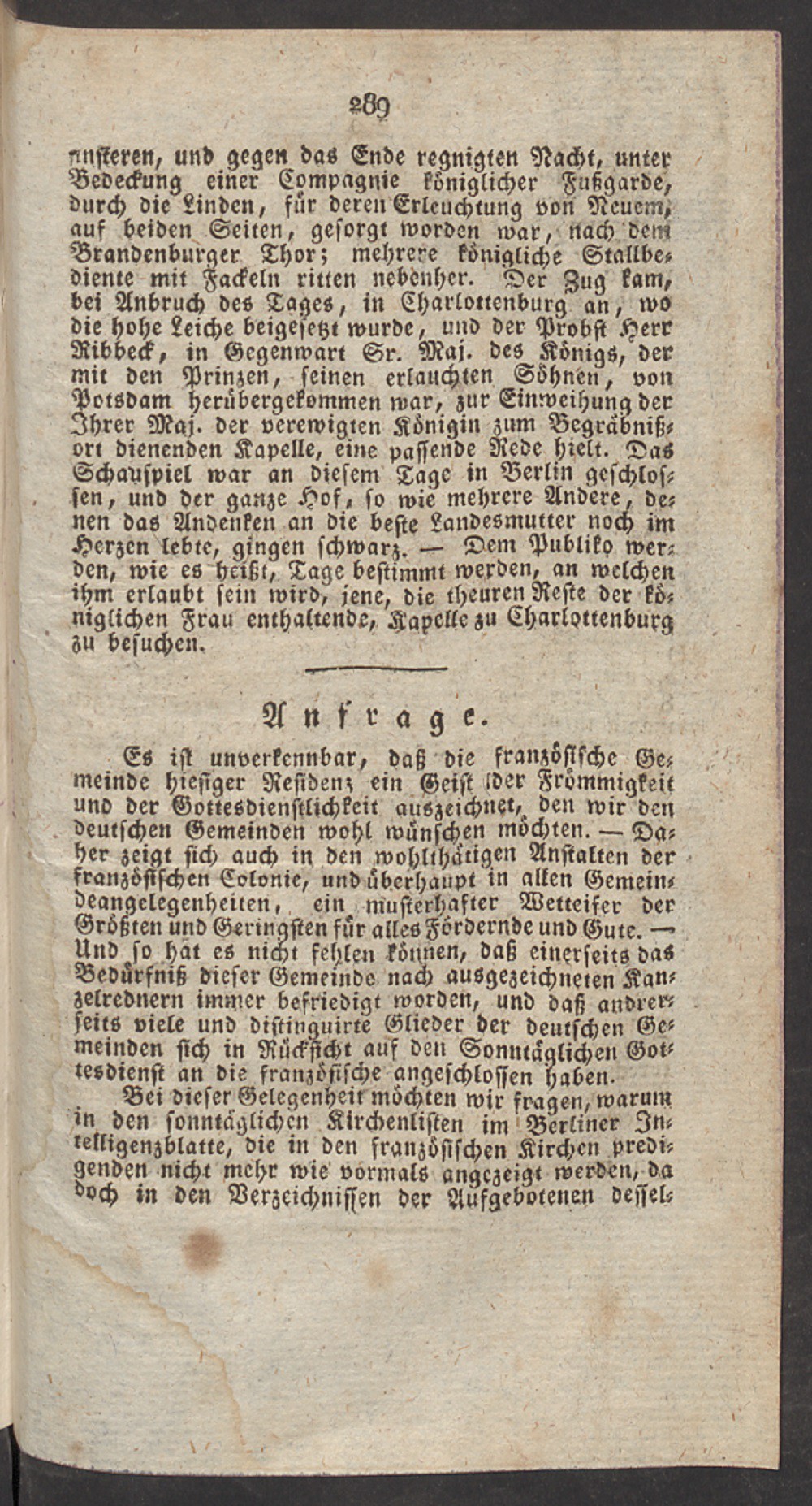 Bei dieser Gelegenheit möchten wir fragen, warum in den sonntäglichen Kirchenlisten im Berliner Intelligenzblatte, die in den französischen Kirchen predigenden nicht mehr wie vormals angezeigt werden, da doch in den Verzeichnissen der Aufgebotenen dessel-