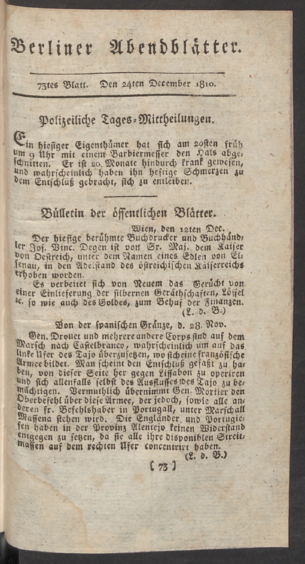 Da der vorige Herr Verleger der Berliner Abendblätter nicht die Schicklichkeit gegen das Publikum beobachtet hat, die Blätter bis zum Schlusse des Jahres zu liefern: so haben wir uns für verpflichtet gehalten, diese Schuld abzutragen, und liefern deshalb die fehlenden Blätter, den 24sten, 27, 28, 29 und 31. Jeder, wer, der Auslieferungsliste zufolge, bei Herrn Hitzig pränumeriert hat, erhält diese Blätter gratis. Vom ersten 1811 fängt das neue Abonnement an, das, wie bisher, vierteljährlich 18 gute Groschen beträgt. Das einzelne Stück kostet 8 Pfennige gutes Geld. Die Blätter werden regelmäßig in unserem Büreau, Leipziger- und Charlotten-Ecke, Nro. 36, Punkt 5 Uhr des Abends, ausgegeben. Dienstboten, und wer sonst zur Abholung geschickt wird, brauchen in Zukunft keinen Augenblick länger zu warten, als zur Empfangnahme der Blätter nöthig ist. Berlin, den 22sten Dec. 1810.