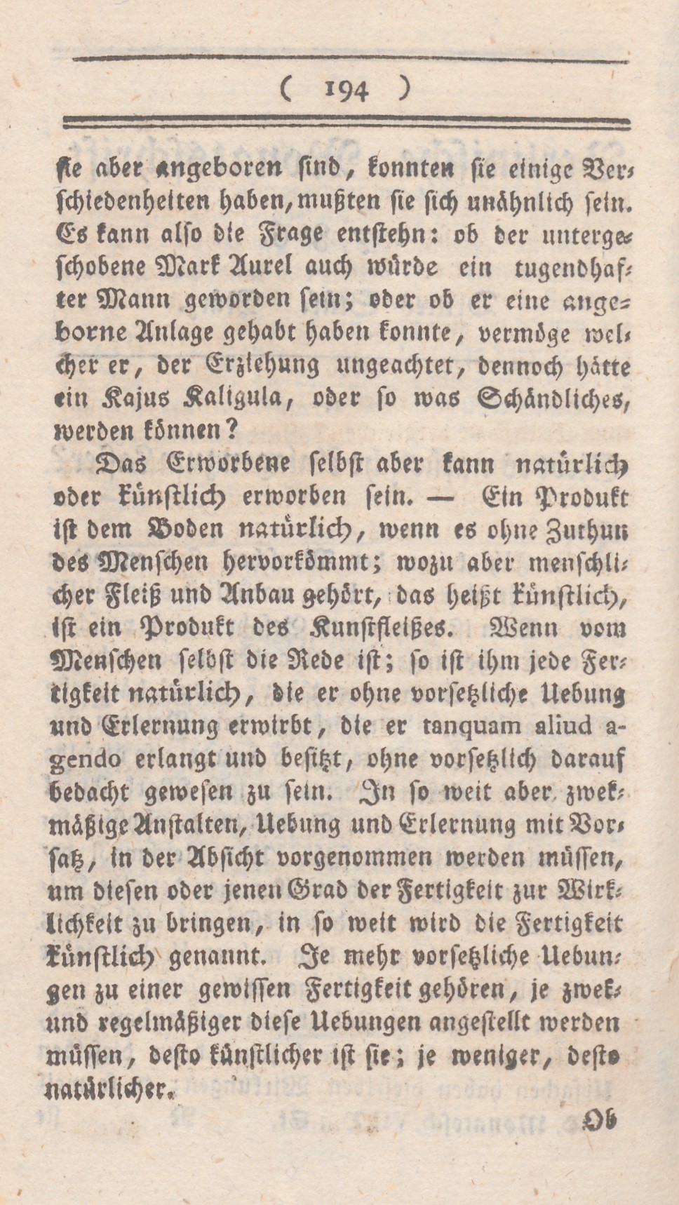 ... sie aber angeboren sind, konnten sie einige Verschiedenheiten haben, mußten sie sich unähnlich sein. Es kann also die Frage entstehn: ob der untergeschobene Mark Aurel auch würde ein tugendhafter Mann geworden sein; oder ob er eine angeborene Anlage gehabt haben konnte, vermöge welcher er, der Erziehung ungeachtet, dennoch hätte ein Kasus Kaligula, oder so was Schändliches, werden können?
