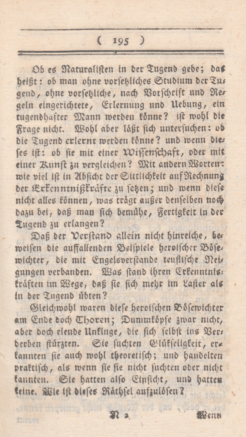 Ob es Naturalisten in der Tugend gebe; das heißt: ob man ohne vorsetzliches Studium der Tugend, ohne vorsetzliche, nach Vorschrift und Regeln eingerichtete, Erlernung Uebung, ein tugendhafter Mann werden könne? ist wohl die Frage nicht. Wohl aber läßt sich untersuchen: ob die Tugend erlernt werden könne? und wenn dieses ist: ob sie mit einer Wissenschaft, oder mit einer Kunst zu vergleichen? Mit anderen Worten: wie viel ist in Absicht der Sittlichkeit auf Rechnung der Erkenntnißkräfte zu setzen; und wenn diese nicht alles können, was trägt außer denselben noch dazu bei, daß man sich bemühe, Fertigkeit in der Tugend zu erlangen?