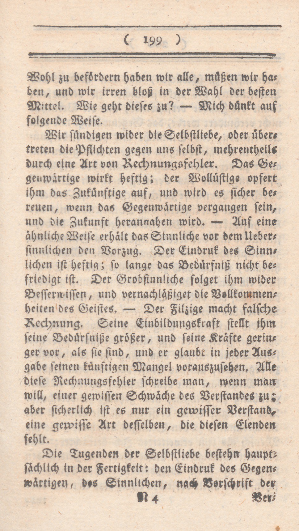 Wir sündigen wider die Selbstliebe, oder übertreten die Pflichten gegen uns selbst, mehrentheils durch eine Art von Rechnungsfehler. Das Gegenwärtige wirkt heftig; der Wollüstige opfert ihm das Zukünftige auf, und wird es sicher bereuen, wenn das Gegenwärtige vergangen sein, und die Zukunft herannahen wird.— Auf eine ähnliche Weise erhält das Sinnliche vor dem Uebersinnlichen den Vorzug. Der Eindruk des Sinnlichen ist heftig; so lange das Bedürfniß nicht befriedigt ist. Der Grobsinnliche folgt ihm wider Besserwissen, und vernachläßiget die Vollkommenheiten des Geistes. – Der Filzige macht falsche Rechnung. Seine Einbildungskraft stellt ihm seine Bedürfnisse größer, und seine Kräfte geringer vor, als sie sind, und er glaubt in jeder Ausgabe seinen künftigen Mangel vorauszusehen. Alle diese Rechnungsfehler schreibe man, wenn man will, einer gewissen Schwäche des Verstandes zu; aber sicherlich ist es nur ein gewisser Verstand, eine gewisse Art desselben, die diesen Elenden fehlt.