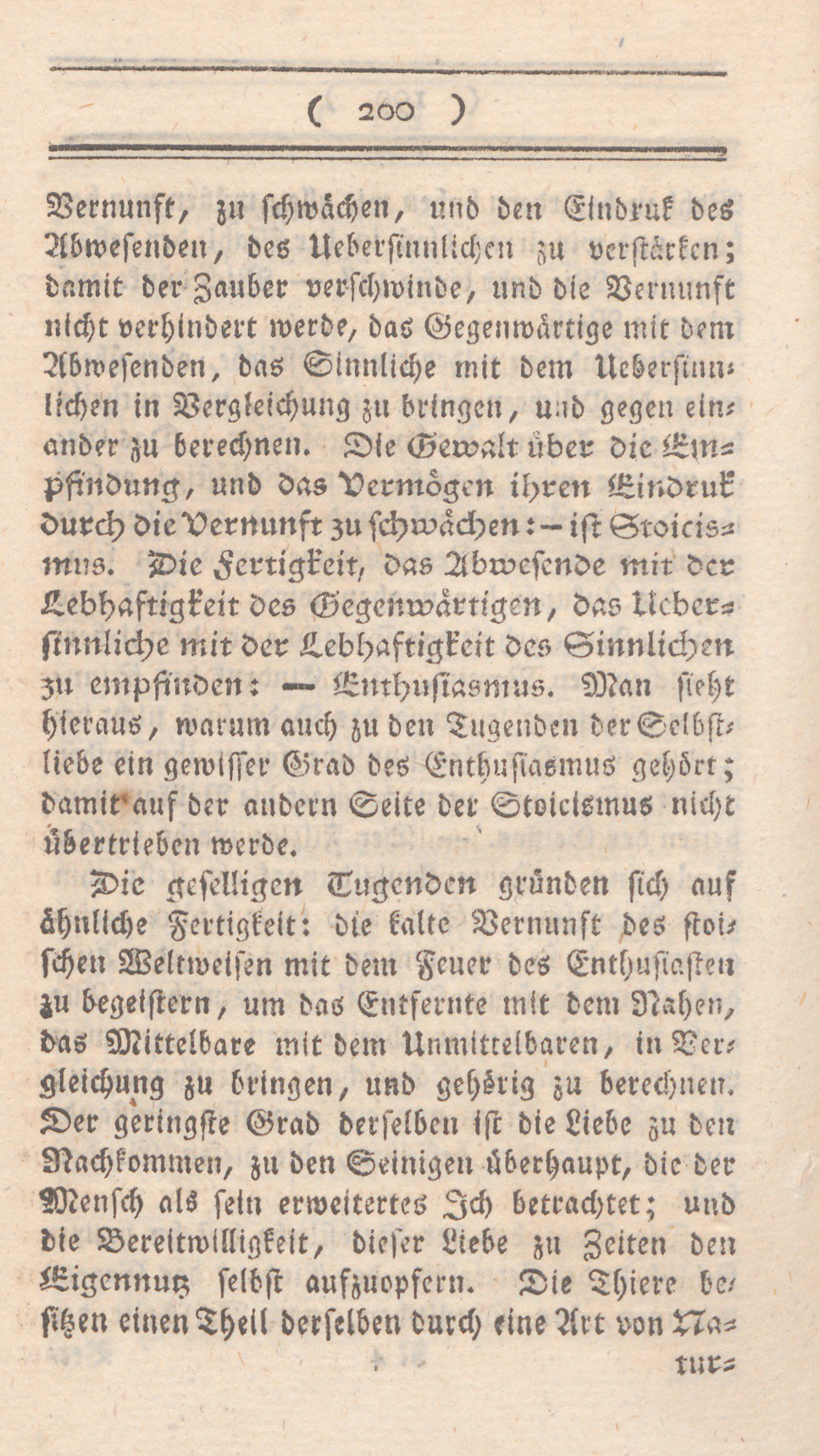 Vernunft, zu schwächen, und den Eindruk des Abwesenden, des Uebersinnlichen zu verstärken; damit der Zauber verschwinde, und die Vernunft nicht verhindert werde, das Gegenwärtige mit dem Abwesenden, das Sinnliche mit dem Uebersinnlichen in Vergleichung zu bringen, und gegen einander zu berechnen. Die Gewalt über die Empfindung, und das Vermögen ihren Eindruk durch die Vernunft zu schwächen: ist Stoicismus. Die Fertigkeit, das Abwesende mit der Lebhaftigkeit des Gegenwärtigen, das Uebersinnliche mit der Lebhaftigkeit des Sinnlichen zu empfinden: – Enthusiasmus. Man sieht hieraus, warum auch zu den Tugenden der Selbstliebe ein gewisser Grad des Enthusiasmus gehört; damit auf der andern Seite der Stoicismus nicht übertrieben werde.