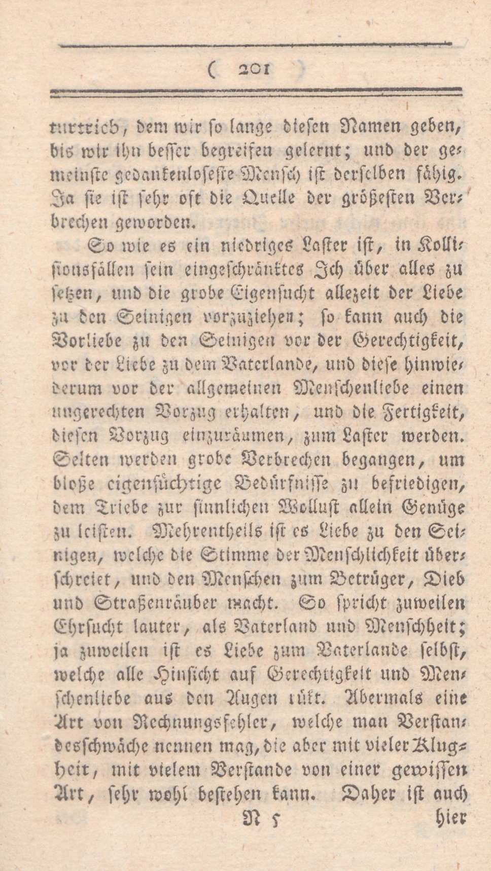 So wie es ein niedriges Laster ist, in Kollisionsfällen sein eingeschränktes Ich über alles zu setzen, und die grobe Eigensucht allzeit der Liebe zu den Seinigen vorzuziehen; so kann auch die Vorliebe zu den Seinigen vor der Gerechtigkeit, vor der Liebe zu dem Vaterlande, und diese hinwiederum vor der allgemeinen Menschenliebe einen ungerechten Vorzug erhalten, und die Fertigkeit, diesen Vorzug einzuräumen, zum Laster werden. Selten werde grobe Verbrechen begangen, um bloße eigensüchtige Bedürfnisse zu befriedigen, dem Triebe zur sinnlichen Wollust allein Genüge zu leisten. Mehrentheils ist es Liebe zu den Seinigen, welche die Stimme der Menschlichkeit überschreiet, und den Menschen zum Betrüger, Dieb und Straßenräuber macht. So spricht zuweilen Ehrsucht lauter, als Vaterland und Menschheit; ja zuweilen ist es Liebe zum Vaterlande selbst, welche alle Hinsicht auf Gerechtigkeit und Menschenliebe aus den Augen rükt. Abermals eine Art von Rechnungsfehler, welche man Verstandesschwäche nennen mag, die aber mit vieler Klugheit, mit vielem Verstande von einergewissen Art, sehr wohl bestehen kann. Daher ist auch