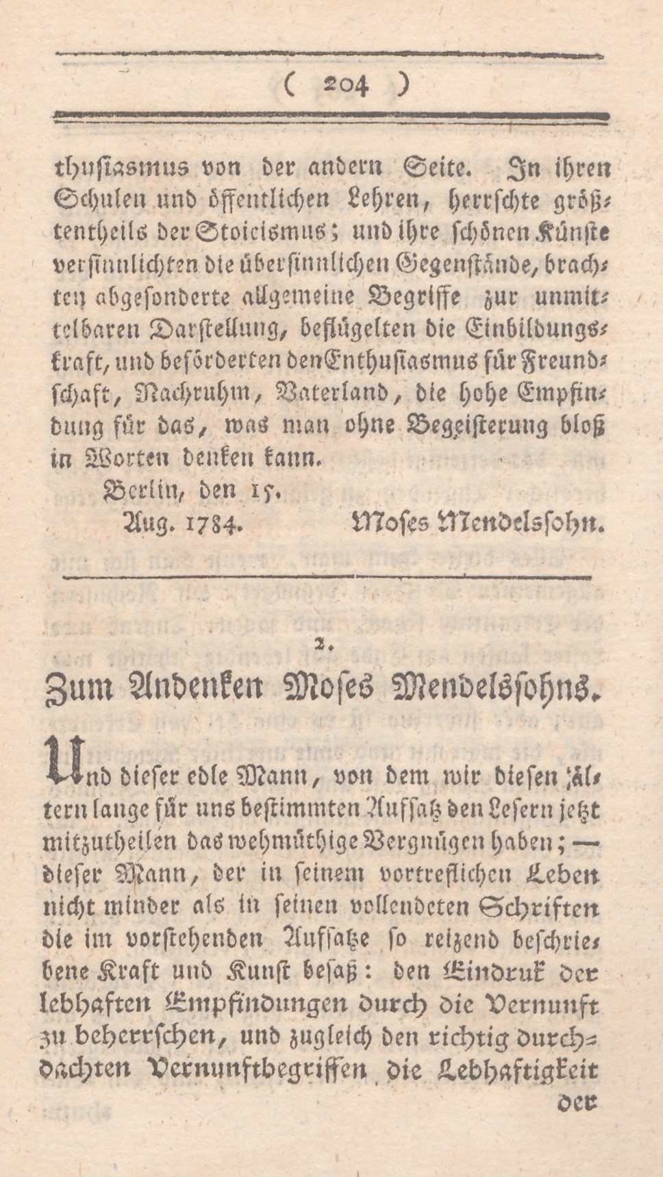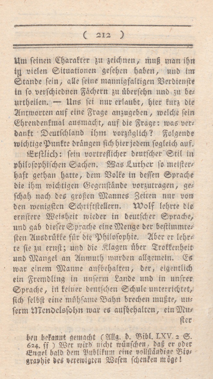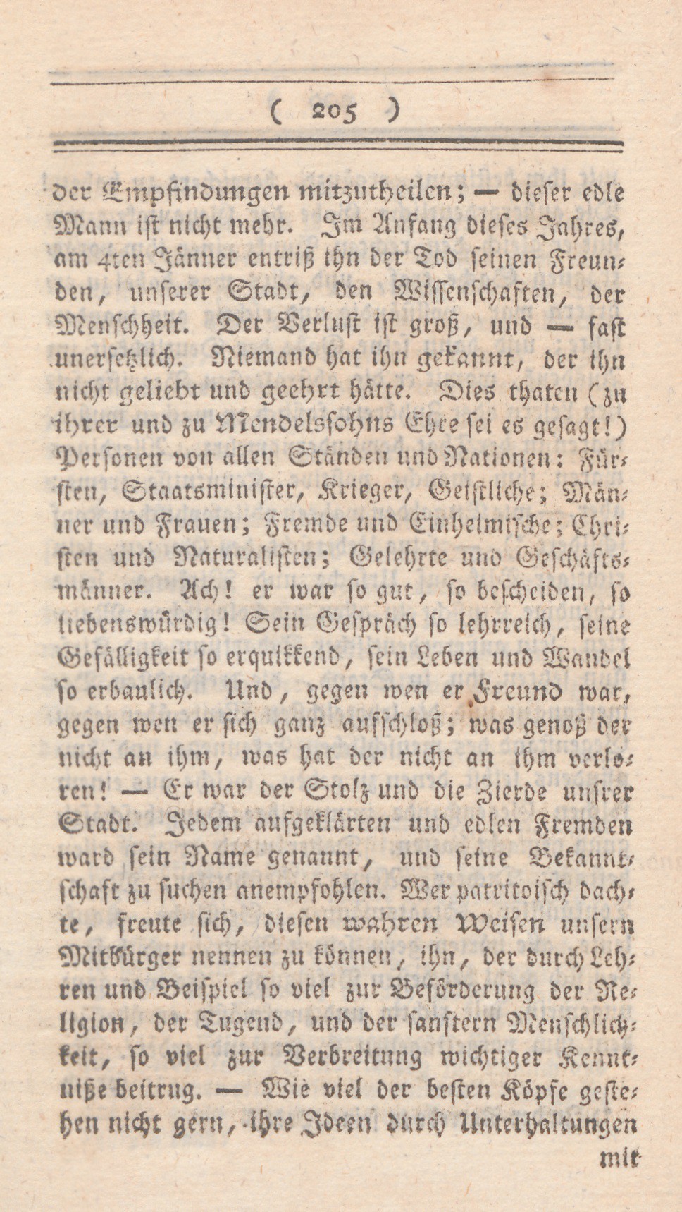 der Empfindungen mitzutheilen; – dieser edle Mann ist nicht mehr. Im Anfang dieses Jahres, am4ten Januar entriß ihn der Tod seinen Freunden, unserer Statdt, den Wissenschaften, der Menschheit. Der Verlust ist groß, und – fast unersetzlich. Niemand hat ihn gekannt, der ihn nicht geliebt und geehrt hätte. Dies thaten (zu ihrer und zu Mendelssohns Ehre sei es gesagt!) Personen von allen Ständen und Nationen: Fürsten, Staatsminister, Krieger, Geistliche; Männer und Frauen; Fremde und Einheimische; Christen und Naturalisten; Gelehrte und Geschäftsmänner. Ach! er war so gut, so bescheiden, so liebenswürdig! Sein Gespräch so lehrreich, seine Gefälligkeit so erquikkend, sein Leben und Wamndel so erbaulich. Und, gegen wen er Freund war, gegen wen er sich ganz aufschloß; was genoß der nicht an ihm, was hat der nicht an ihm verloren! – Er war der Stolz und die Zierde unsrer Stadt.Jedem aufgeklärten und edlen Fremden ward sein Name genannt, und seine Bekanntschaft zu suchen anempfohlen. Wer patriotisch dachte, freute sich, diesen wahren Weisen unsern Mitbürger nennen zu können, ihn, der durch Lehren und Beispiel so viel zur Beförderung der Religion, der Tugend, und der sanftern Menschlichkeit, so viel zur Verbreitung wichtiger Kenntniße beitrug. – Wie viel der besten Köpfe gestehen nicht gern, ihre Ideen durch Unterhaltungen