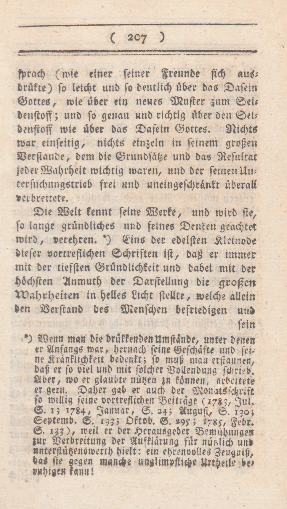 ) Wenn man die drükkenden Umstände, unter denen er Anfangs war, hernach seine Geschäfte und seine Kränklichkeit bedenkt; so muß man erstaunen, daß er so viel und mit solcher Vollendung schrieb. Aber, wo er glaubte nützen zu können, arbeitete er gern. Daher gab er auch der Monatsschrift so willig seine vortrefflichen Beiträge (1783, Jul. S.1; 1784, Januar, S.24; August, S. 130; Septemb. S. 193; Pktob. S. 295; 1785, Febr. S. 133), weil er der Herausgeber Bemühungen zur Verbreitung der Aufklärung für nützlich und unterstützenswerth hielt: ein ehrenvolles Zeugniß, das sie gegen manche unglimpfliche Urtheile beruhigen kann!