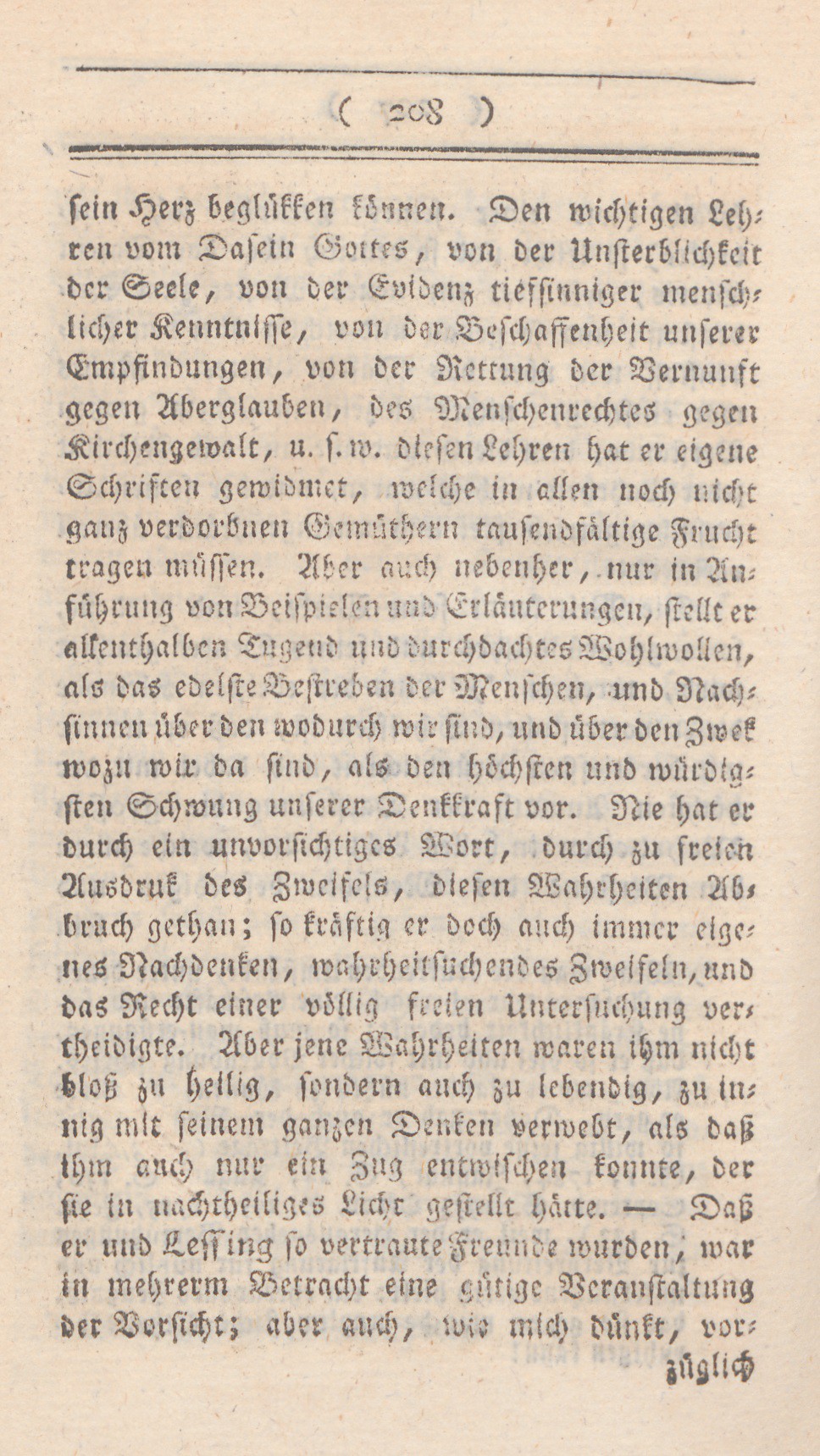 seinHerz beglükken können. Den wichtigen Lehren vom Dasein Gottes, von der Unsterblichkeit der Seele, von der Evidenz tiefsinniger menschlicher Kenntnisse, von der Beschaffenheit unserer Empfindungen, von der Rettung der Vernunft gegen Aberglauben, des Menschenrechtes gegen Kirchengewalt, u.s.w. diesen Lehren hat er eigene Schriften gewidmet, welche in allen noch nicht ganz verdorbnen Gemüthern tausendfältige Frucht tragen müssen. Aber auch nebenher, nur in Anführung von Beispielen und Erläuterungen, stellt er allenthalben Tugend und durchdachtes Wohlwollen, als das edelste Bestreben der Menschen, und Nachsinnen über den wodurch wir sind, und über den Zwek wozu wir da sind, als den höchsten und würdigsten Schwung unserer Denkkraft vor. Nie hat er durch ein unvorsichtiges Wort, durch zu freien Ausdruk des Zweifels, diesen Wahrheiten Abbruch gethan; so kräftig er doch auch immer eigenes Nachdenken, wahrheitsuchendes Zweifeln, und das Recht einer völlig freien Untersuchung vertheidigte. Aber jene Wahrheiten waren ihm nicht bloß zu heilig, sondern auch zu lebendig, zu innig mit seinem ganzen Denken verwebt, als daß ihm auch nur ein Zug entwischen konnte, der sie in nachtheiliges Licht gestellt hätte. – Daß er und Lessing so vertraute Freunde wurden, war in mehrerm Betracht eine gütige Veranstaltung der Vorsicht; aber auch, wie mich dünkt, vor=