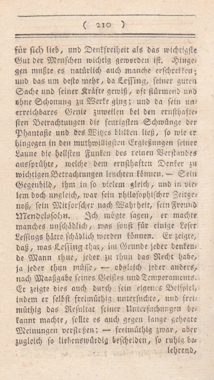 für sich lieb, und Denkfreiheit als das wichtigste Gut der Menschen wichtig geworden ist. Hingegen mußte es natürlich auch manche erschrekken; und das um desto mehr, da Lessing, seiner guten Sache und seiner Kräfte gewiß, oft stürmend und ohne Schonung zu Werke ging; und da sein unerreichbares Genie zuweilen bei den ernsthaftesten Betrachtungen die feurigsten Schwünge der Phantasie und des Witzes blikken ließ, so wie er hingegen in den muthwilligsten Ergießungen seiner Laune die hellsten Funken des reinen Verstandes aussprühte, welche dem ernsthaften Denker zu wichtigen Betrachtungen leuchten können. – Sein Gegenbild, ihm in so vielem gleich, und in vielem doch ungleich, war sein philosophischer Zeitgenoß, sein Mitforscher nach Wahrheit, sein Freund Mendelssohn. Ich mögte sagen, er machte manches unschädlich, was sonst für einige Leser Lessings hätte schädlich werden können. Er zeigte, daß, was Lessing that, im Grunde jeder denkende Mann thue, jeder zu thun das Recht habe, ja jeder thun müsse – obgleich jeder anders, nach Maaßgabe seines Geistes und Temperaments. Er zeigte dies auch durch sein eigenes Beispiel, indem er selbst freimüthig untersuchte, und freimüthig das Resultat seiner Untersuchungen bekannt machte, sollte es auch gegen lange gehegte Meinungen verstoßen; – freimüthig zwar, aber zugleich so liebenswürdig bescheiden, so ruhig be=