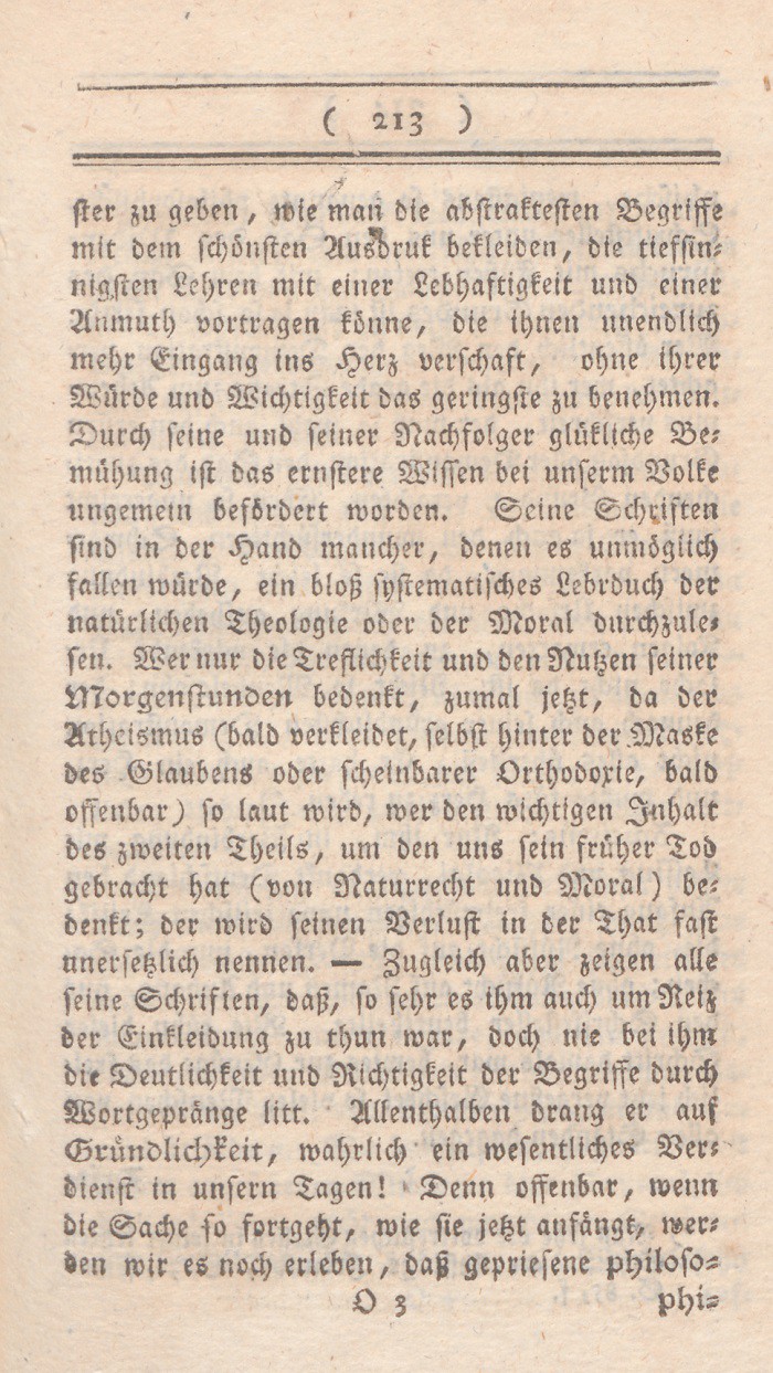 ster zu geben, wie man die abstraktesten Begriffe mit dem schönsten Ausdruk bekleiden, die tiefsinnigsten Lehren mit einer Lebhaftigkeit und einer Anmuth vortragen könne, die ihnen unendlich mehr Eingang ins Herz verschafft, ohne ihrer Würde und Wichtigkeit das geringste zu benehmen. Durch seine und seiner Nachfolger glükliche Bemühung ist das ernstere Wissen bei unserm Volke ungemein befördert worden. Seine Schriften sind in der Hand mancher, denen es unmöglich fallen würde, ein bloß systematisches Lehrbuch der natürlichen Theologie oder der Moral durchzulesen. Wer nur die Treflichkeit und den Nutzen seiner Morgenstunden bedenkt, zumal jetzt, da der Atheismus (bald verkleidet, selbst hinter der Maske des Glaubens oder scheinbarer Orthodoxie, bald offenbar) so laut wird, wer den wichtigen Inhalt des zweiten Theils, um den uns sein früher Tod gebracht hat (von Naturrecht und Moral) bedenkt; der wird seinen Verlust in der That fast unersetzlich nennen. – Zugleich aber zeigen alle seine Schriften, daß, so sehr es ihm auch um Reiz der Einkleidung zu thun war, doch nie bei ihm die Deutlichkeit und Richtigkeit der Begriffe durch Wortgepränge litt. Allenthalben drang er auf Gründlichkeit, wahrlich ein wesentliches Verdienst in unsern Tagen! Denn offfenbar, wenn die Sache so fortgeht, wie sie jetzt anfängt, werden wir es noch erleben, daß gepriesene philoso=