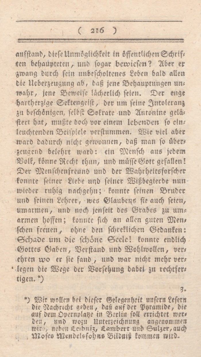 *) Wir wollen bei dieser Gelegenheit unsern Lesern die Nachricht geben, daß auf der Pyramide, die auf dem Opernplatze in Berlin soll errichtet werden, und wozu Unterzeichnung angenommen wird, neben Leibniz, Lambert und Sulzer, auch Moses Mendelssohns Bildniß kommen wird.