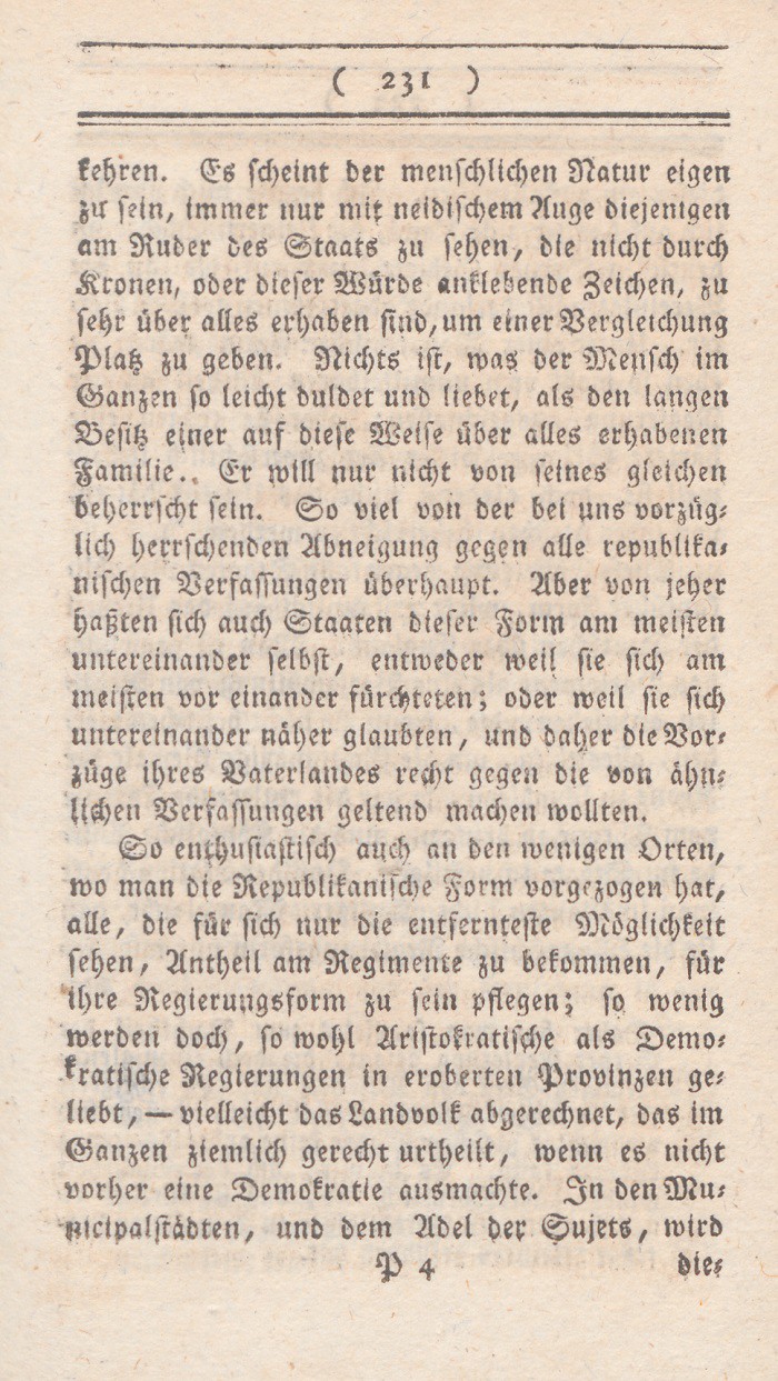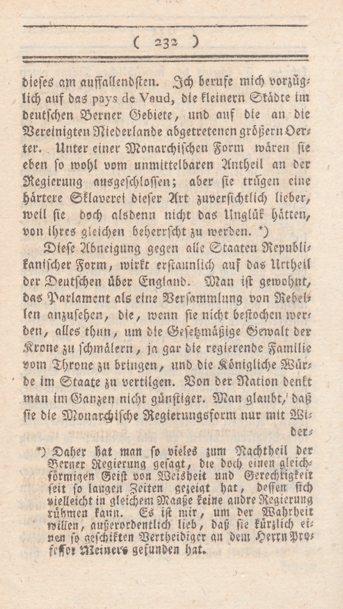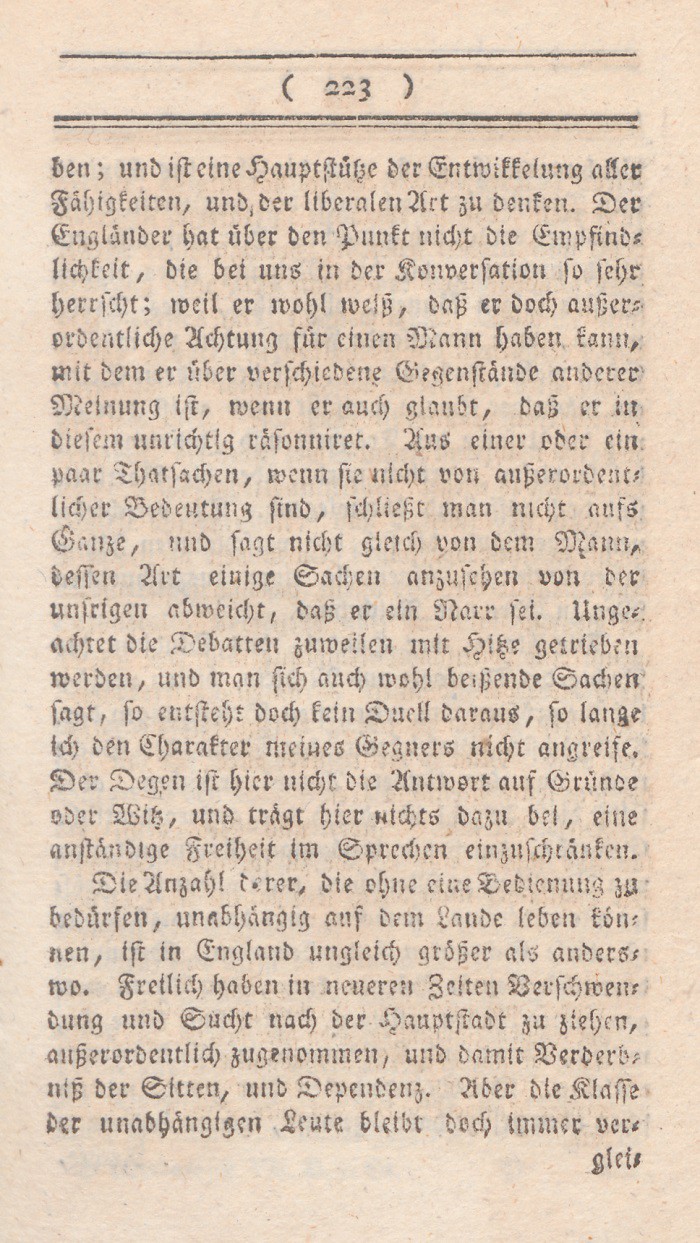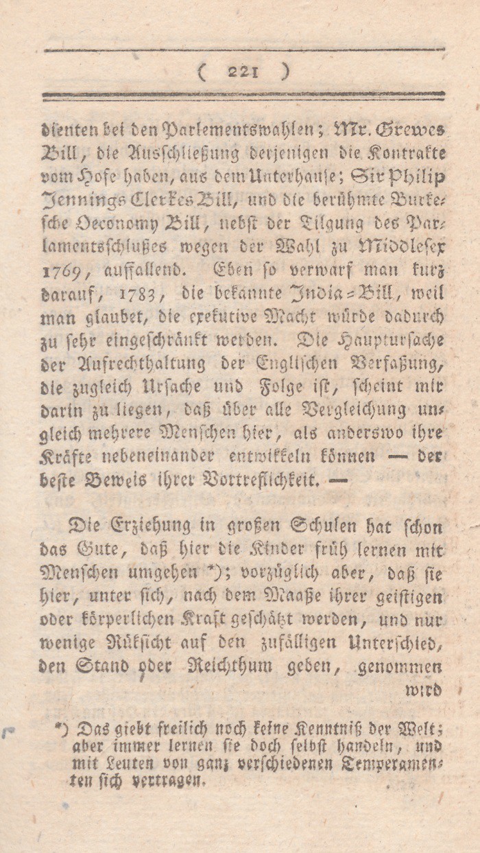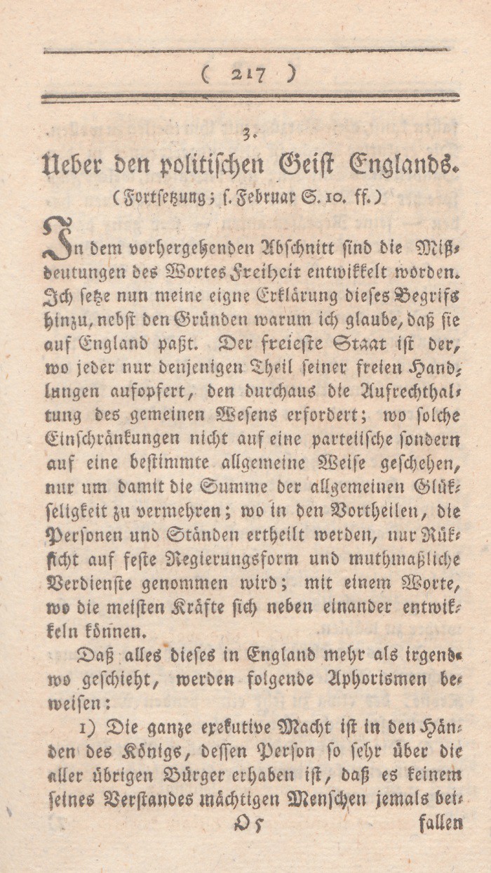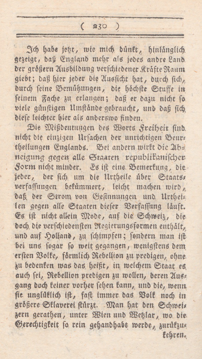 In dem vorhergehenden Abschnitt sind die Mißdeutungen des Wortes Freiheit entwikkelt worden. Ich setze nun meine eigne Erklärung dieses Begrifs hinzu, nebst den Gründen warum ich glaube, daß sie auf England paßt. Der freieste Staat ist der, wo jeder nur denjenigen Theil seiner freien Handlungen aufopfert, den durchaus die Aufrechthaltung des gemeinen Wesens erfordert; wo solcheEinschränkungen nicht auf eine parteiische sondern auf eine bestimmte allgemeine Weise geschehen, nur um damit die Summe der allgemeinen Glükseligkeit zu vermehren; wo in den Vortheilen, die Personen und Ständen ertheilt werden, nur Rüksicht auf feste Regierungsform und muthmaßliche Verdienste aufgenommen wird; mit einem Worte, wo die meisten Kräfte sich neben einander entwikkeln können.