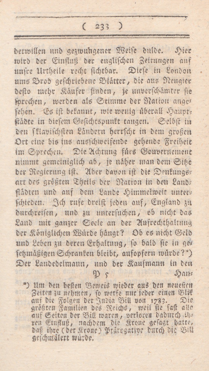 *) Dasselbe Gesuch gestattete wie oben S. 226 Note gezeigt worden, ein kath. Geistlicher. Wenn aber von der Denkungsart einer Partei die Rede ist; so muß man ( wie H. Garve oft und richtig erwähnt) nicht auf einzelne Handlungen einzelner Menschen, sondern auf die Repräsentanten der ganzen Partei sehen.