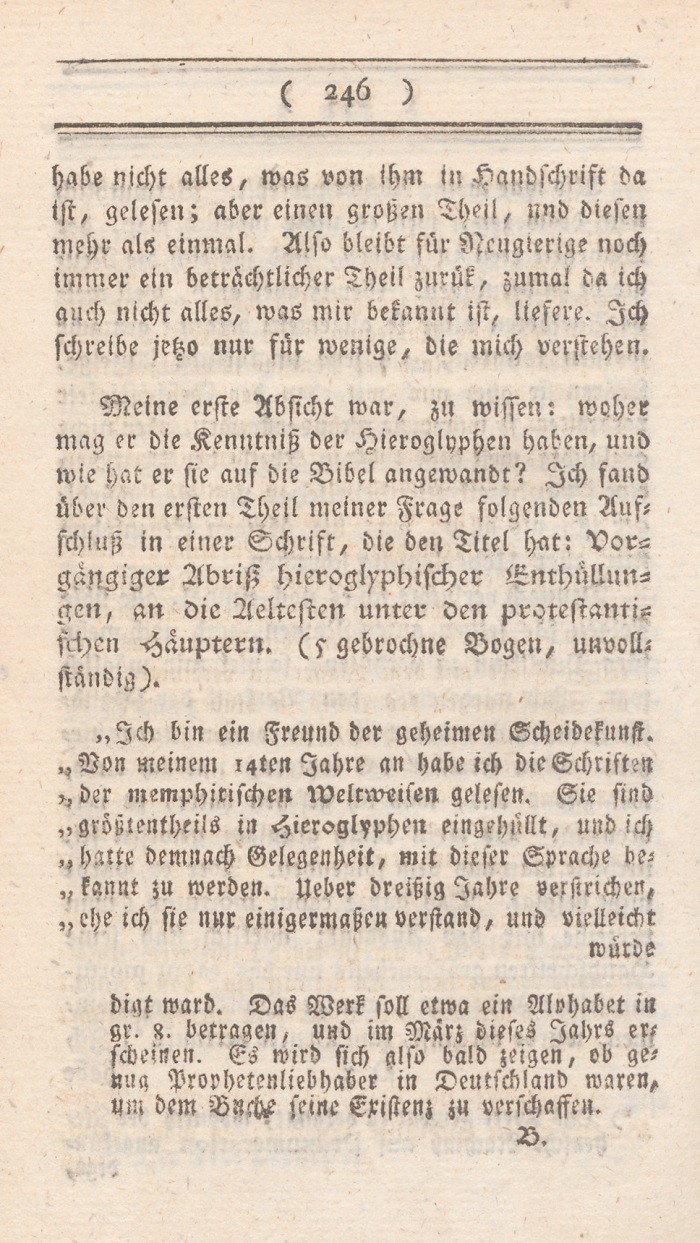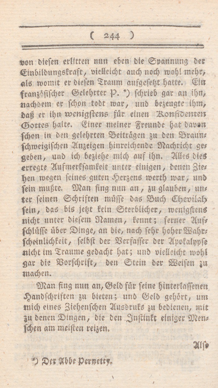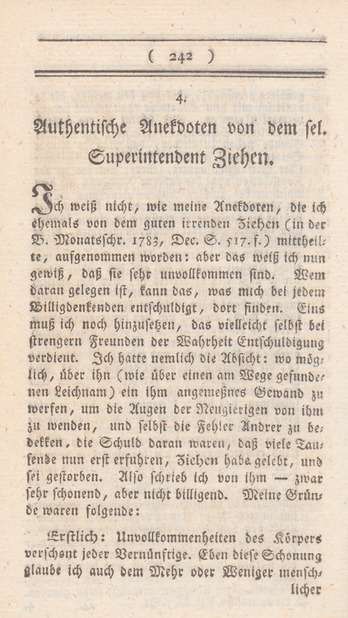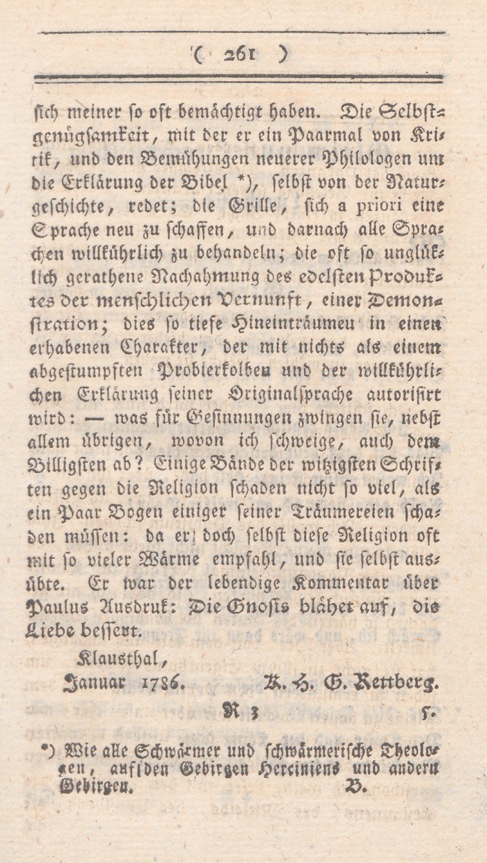 *) Denn es ist, um nur ein einziges Faktum zu nennen doch wohl nicht vernünftig, seine Frau so lange zu streichen, bis sie Visionen und Divination bekömmt? doch wohl nicht vernünftig, irgend einen Brief den man schreibt, für so wahrhaft als Gottes Wort auszugeben? Berl. Monatsschr. 1785, Novemb. S. 437 f.