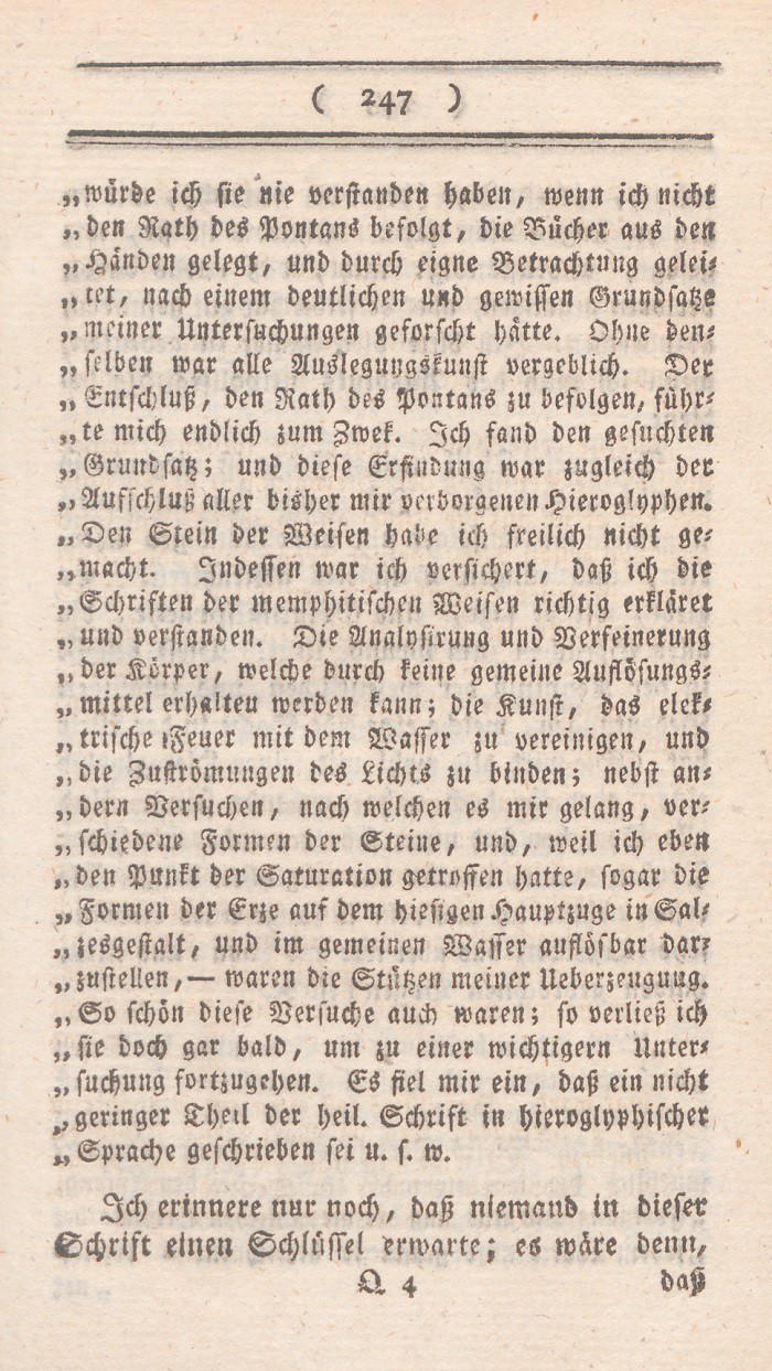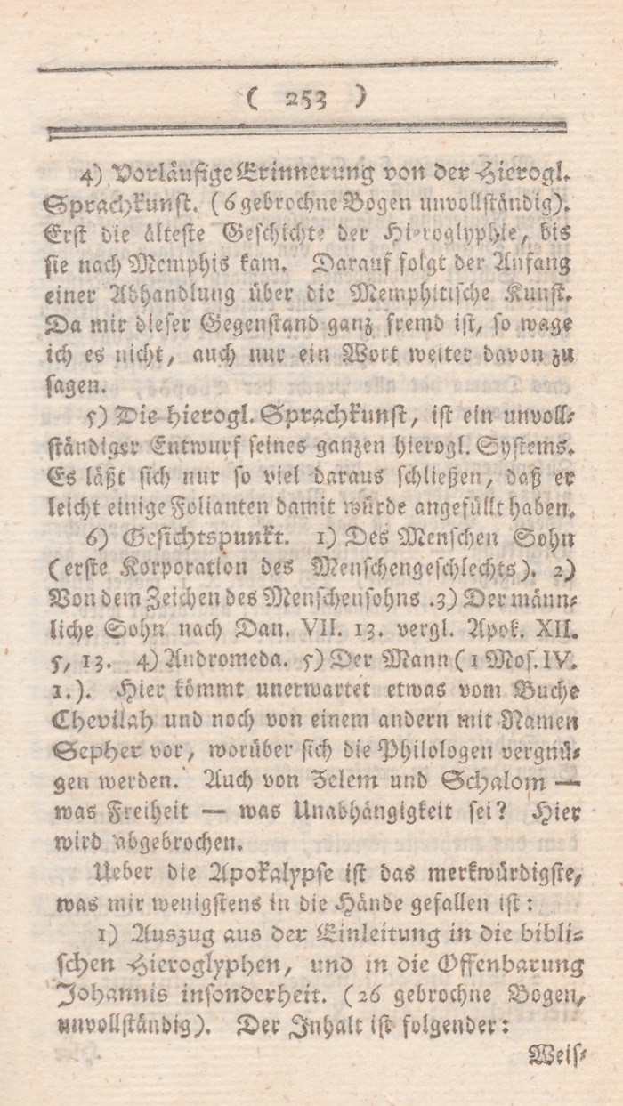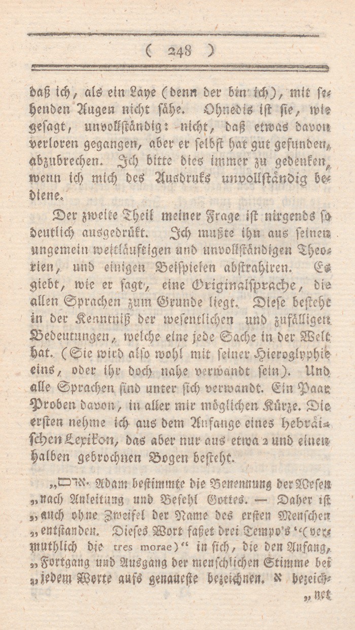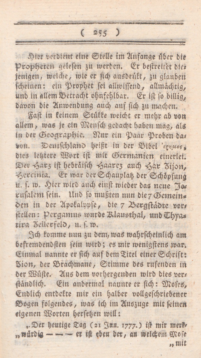 *) Denn es ist, um nur ein einziges Faktum zu nennen doch wohl nicht vernünftig, seine Frau so lange zu streichen, bis sie Visionen und Divination bekömmt? doch wohl nicht vernünftig, irgend einen Brief den man schreibt, für so wahrhaft als Gottes Wort auszugeben? Berl. Monatsschr. 1785, Novemb. S. 437 f.