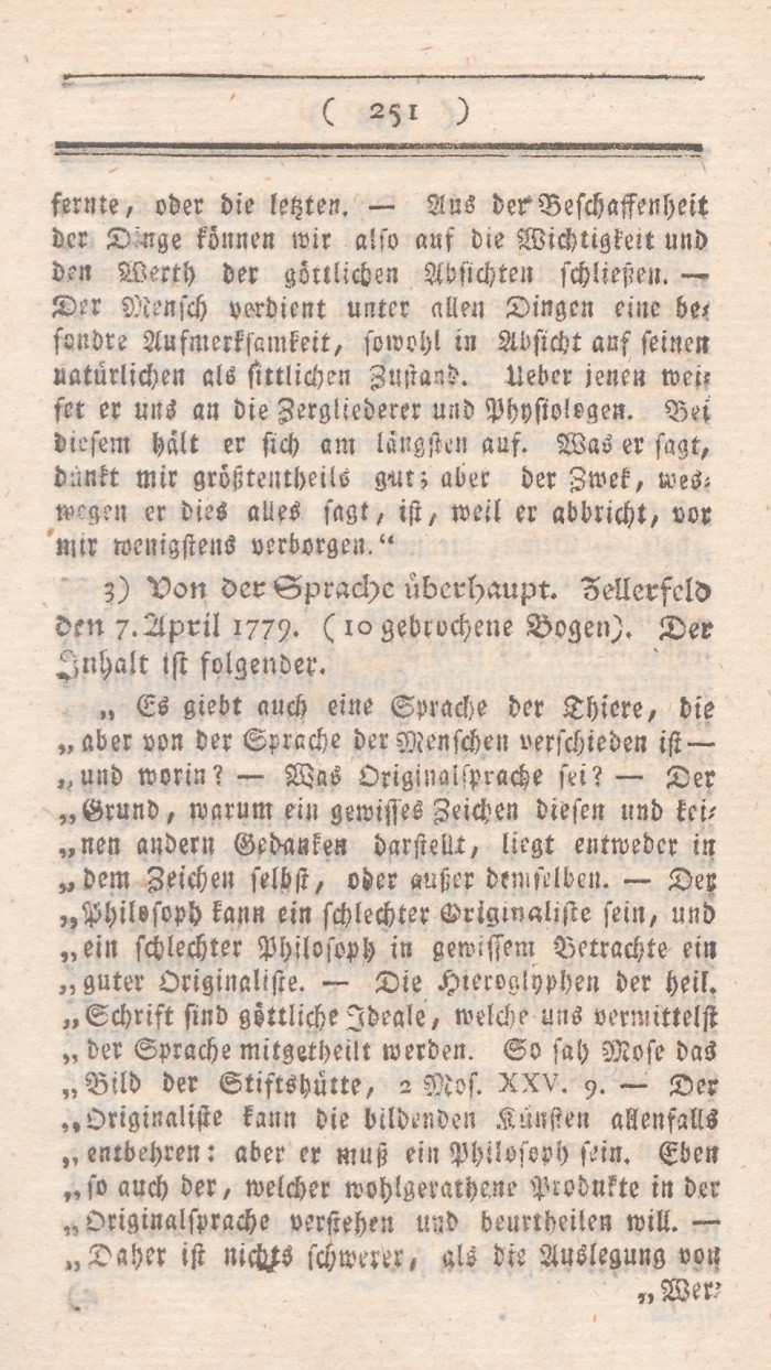 Viertens: Ihm verdankt vorzüglich seine Nation, und dadurch auch ganz Deutschland und die gesammte Menschheit, einen großen Theil ihrer moralischen und intellektuellen Bildung. Ein höchst wichtiger Punkt, der aber, eben weil er zu reichhaltig ist, hier nur kann angedeutet werden. – Seine Liebe zu seiner Nation und zu allem was ihr wichtig ist, hatte auch die unmittelbar nützliche Wirkung für uns, daß sie ihn zu der treflichen Uebersetzung zwei biblischer Bücher veranlaßte.