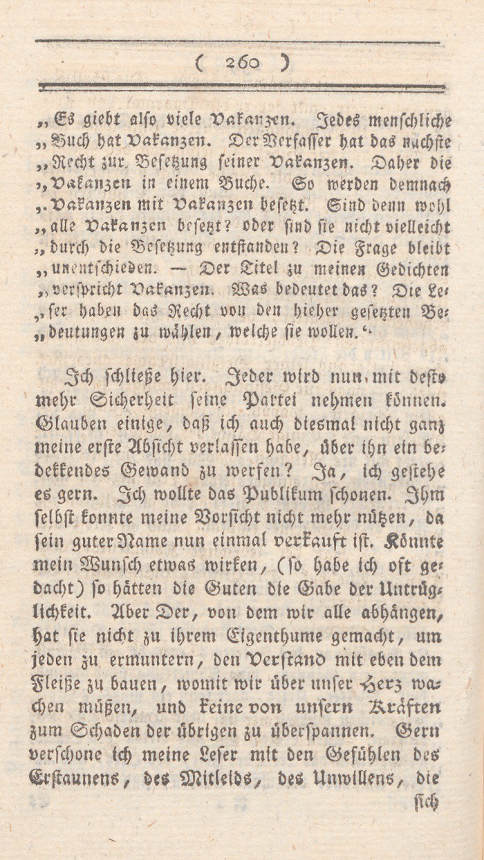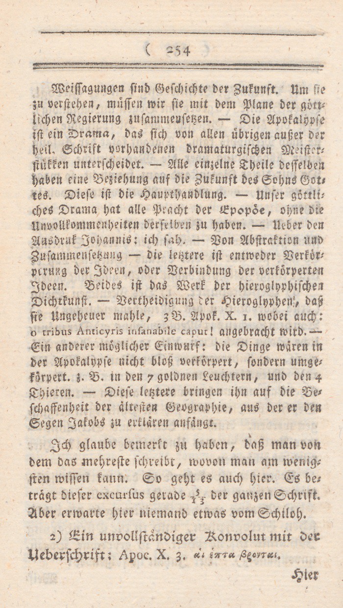 Diese Stelle macht, wie ich sehe, viele und eben so mannigfaltige Sensation. Von der einen Seite ist es ernsthaften Freunden der Wahrheit leid, daß sich ein großer und liebenswürdiger Philosoph, der von wirklichen Christen so aufrichtigverehrt worden, konnte hinreißen lassen, einen so abgenutzten Einfall auf Kosten des Christenthums niederzuschreiben. Vonder anderen höre ich diesen Gedankenhin und wieder als Autorität wiederholen, wo man sich eigenes Nachdenken ersparen, und gern