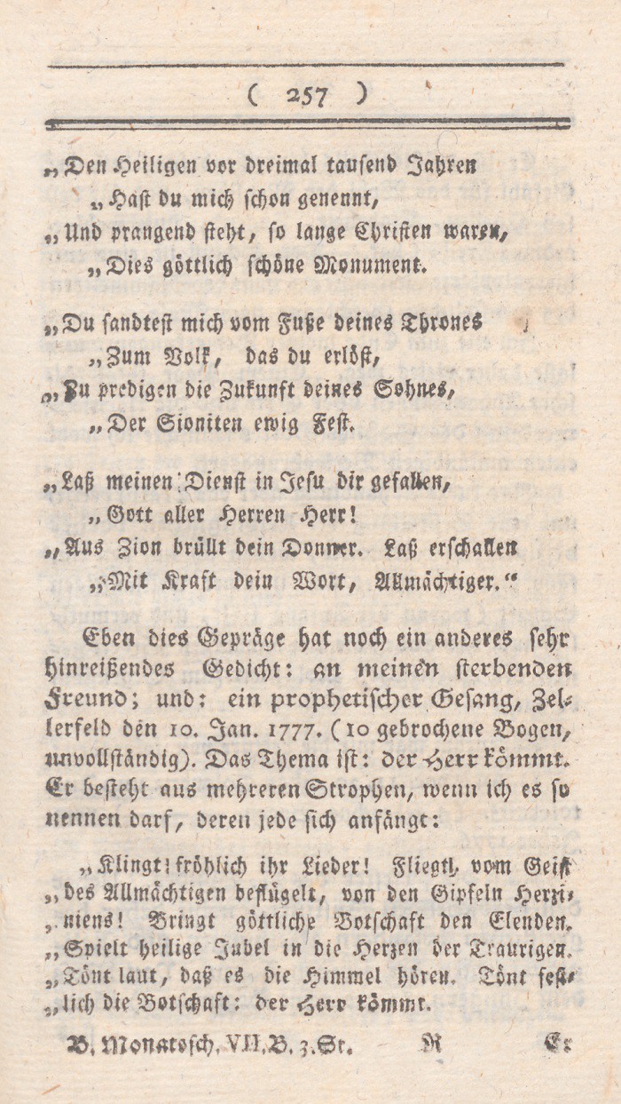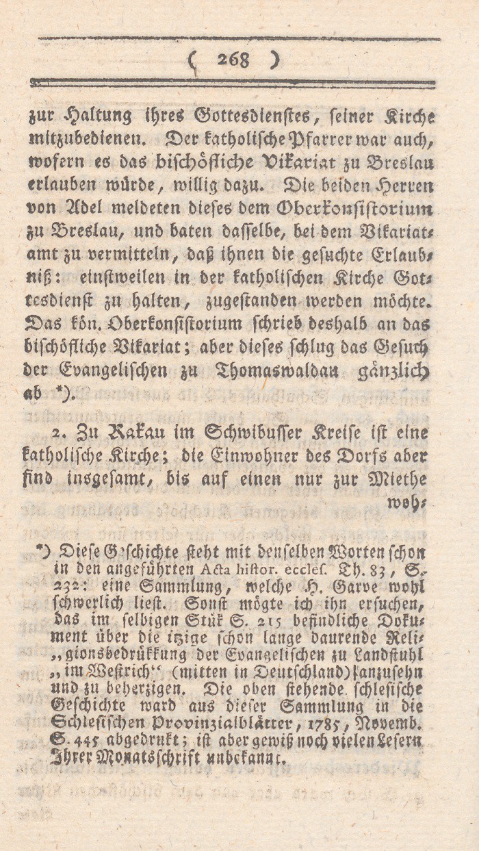 *) Diese Geschichte steht mit denselben Worten schon in den angeführten acta hist. eccles. nostri temporis, Th. 83, S. 232: eine Sammlung, welche H. Garve wohl schwerlich liest. Sonst mögte ich ihn ersuchen, das im selbigen Stük S. 215 befindliche Dokument über die itzige schon lange dauernde Religionsbedrükkung der Evangelischen zu Landstuhl „im Westrich“ (mitten in Deutschland) anzusehen und zu beherzigen. Die oben stehende schlesische Geschichte ward aus dieser Sammlung in die Schlesischen Provinzialblätter, 1785, Novemb. S. 445 abgedrukt; ist aber gewiß noch vielen Lesern Ihrer Monatsschrift unbekannt.
