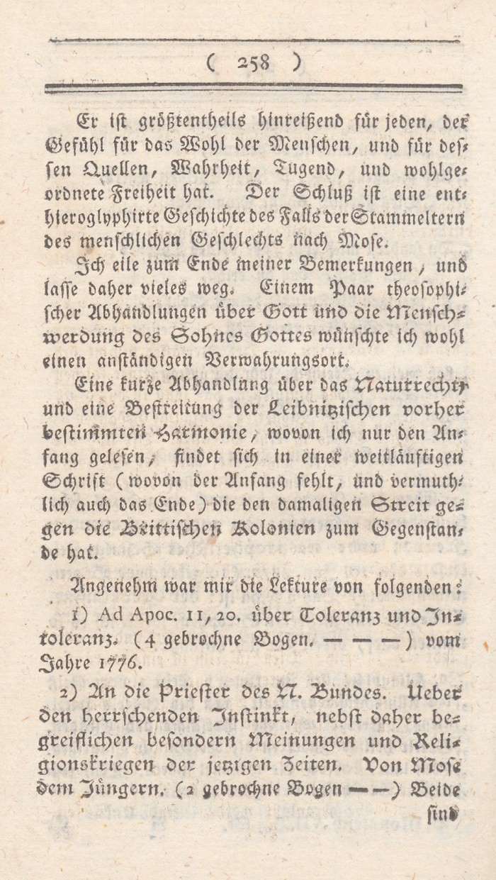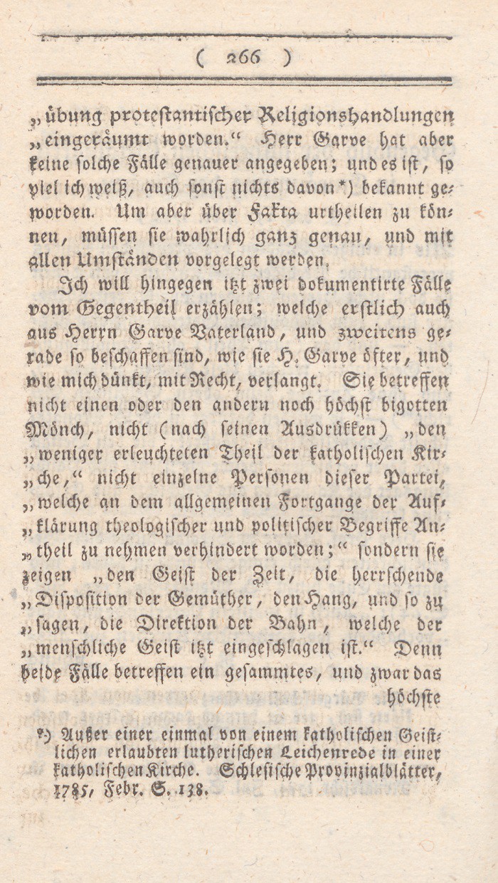 Ich will hingegen itzt zwei dokumentirte Fälle vom Gegentheil erzählen; welche erstlich auch aus Herrn Garves Vaterland, und zweitens gerade so beschaffen sind, wie sie H. Garve öfter, und wie mich dünkt, mit Recht, verlangt. Sie betreffen nicht einen oder den andern noch höchst bigotten Mönch, nicht (nach seinen Ausdrükken) „den weniger erleuchtheten Theil der katholischen Kirche,“ nicht einzelne Personen dieser Partei, welche an dem allgemeinen Fortgange der Aufklärung theologischer und politischer Begriffe Antheil zu nehmen verhindert worden;“ sondern sie zeigen „den Geist der Zeit, die herrschende Disposition der Gemüther, den Hang, und so zu sagen, die Direktion der Bahn, welche der menschliche Geist itzt eingeschlagen ist.“ Denn beide Fälle betreffen ein gesammtes, und zwar das
