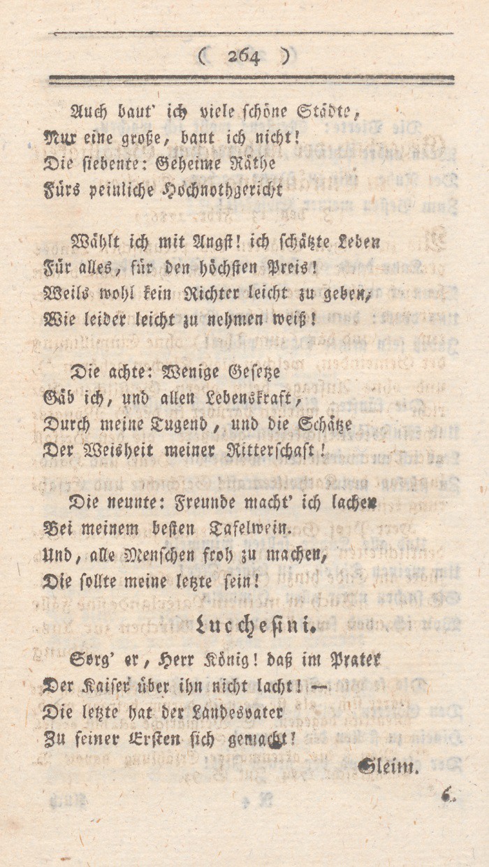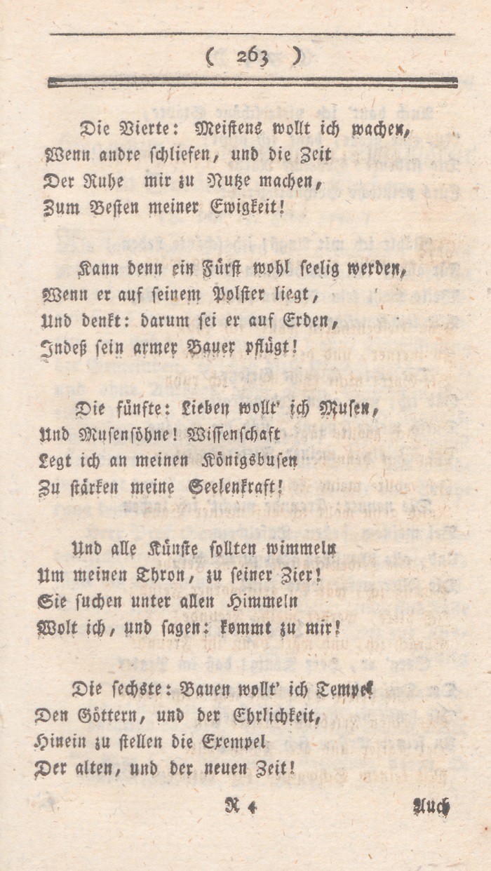 gegen den König, seinen unerschütterlichen Eifer in Besiegung aller Beschwerlichkeiten. – Und dieser rasche tapfre Held war dabei sanftmüthig, fromm, menschenfreundlich, schonend! Er war uneigennützig und edel! Sein so glänzendes Beispiel muß ohnstreitig viele Jünglinge erwekken, deren erster Pfad weniger rauh ist als der seine. Der lebendige Gedanke an ihn muß noch in den entferntesten Zeiten dem Kriegsheere Helden wie ihn, und dem Staate treue Diener wie ihn geben. Sein sie auich immer menschlich und gut, wie er es war!