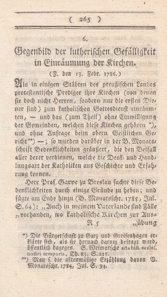Herr Prof. Garve zu Breslau suchte diese Bedenklichkeiten durch einige Gründe zu heben; und fügte am Ende hinzu (B. Monatsschr. 1785, Jul. S. 64): „Auch in meinem Vaterlande sind Fälle vorhanden, wo katholische Kirchen zur Aus =