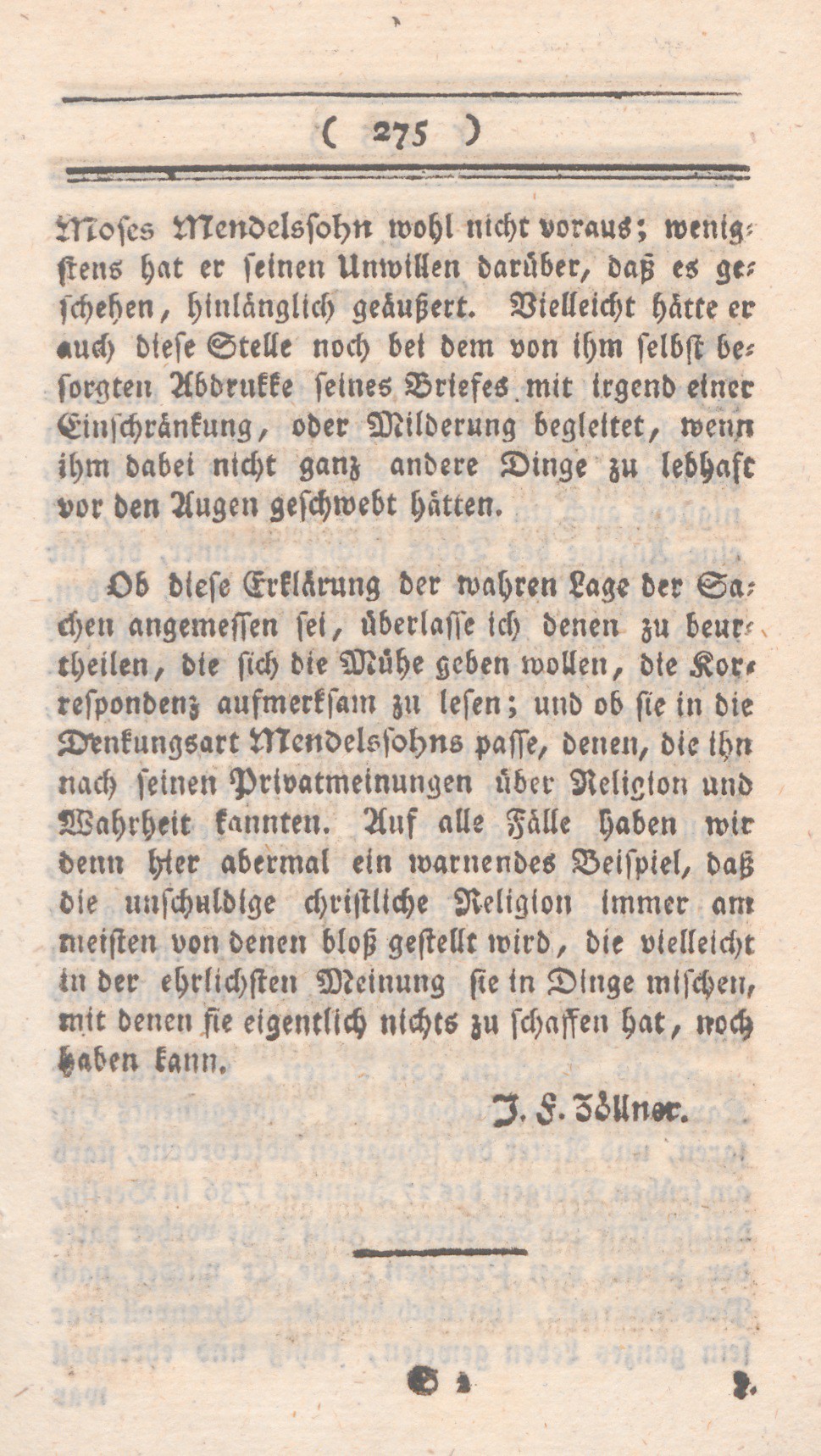 Ob diese Erklärung der wahren Lage der Sachen angemessen sei, überlasse ich denen zu beurtheilen, die sich die Mühe geben wollen, die Korrespondenz aufmerksam zu lesen; und ob sie in die Denkungsart Mendelssohns passe, denen, die ihn nach seinen Privatmeinungen über Religion und Wahrheit kannten. Auf alle Fälle haben wir denn hier abermal ein warnendes Beispiel, daß die unschuldige christliche Religion immer am meisten von denen bloß gestellt wird, die vielleicht in der ehrlichsten Meinung sie in Dinge mischen, mit denen sie eigentlich nichts zu schaffen hat, noch haben kann.