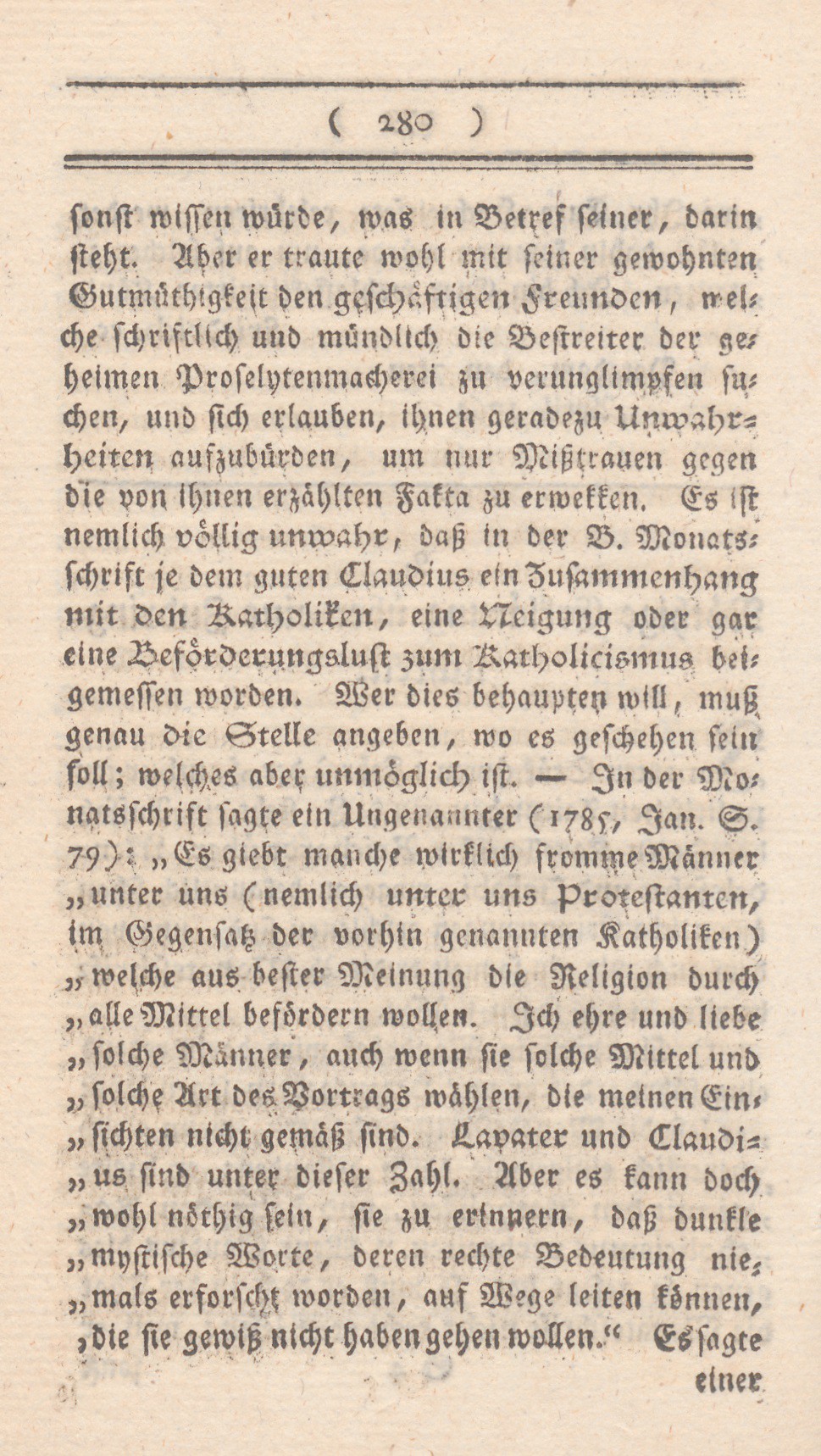 sonst wissen würde, was in Betref seiner, darin steht. Aber er traute wohl mit seiner gewohnten Gutmüthigkeit den geschäftigen Freunden, welche schriftlich und mündlich die Bestreiter der geheimen Proselytenmacherei zu verunglimpfen suchen, und sich erlauben, ihnen geradezu Unwahrheiten aufzubürden, um nur Mißtrauen gegen die von ihnen erzählten Fakta zu erwekken. Es ist nemlich völlig unwahr, daß in der B. Monatsschrift je dem guten Claudius ein Zusammenhang mit den Katholiken, eine Neigung oder gar eine Beförderungslust zum Katholicismus beigemessen worden. Wer dies behaupten will, muß genau die Stelle angeben, wo es geschehen sein soll; welches aber unmöglich ist. – In der Monatsschrift sagte ein Ungenannter (1785, Fan. S. 79): „Es giebt manche wirklich fromme Männer unter uns (nemlich unter uns Protestanten, im Gegensatz der vorhin genannten Katholiken) welche aus bester Meinung die Religion durch alle Mittel befördern wollen. Ich ehre und liebe solche Männer, auch wenn sie solche Mittel und solche Art des Vortrags wählen, die meinen Einsichten nicht gemäß sind. Lavater und Claudius sind unter dieserZahl. Aber es kann doch wohl nöthig sein, sie zu erinnern, daß dunkle mystische Worte, deren rechte Bedeutung niemals erforscht worden, auf Wege leiten können, die sie gewiß nicht haben gehen wollen.“ Es sagte