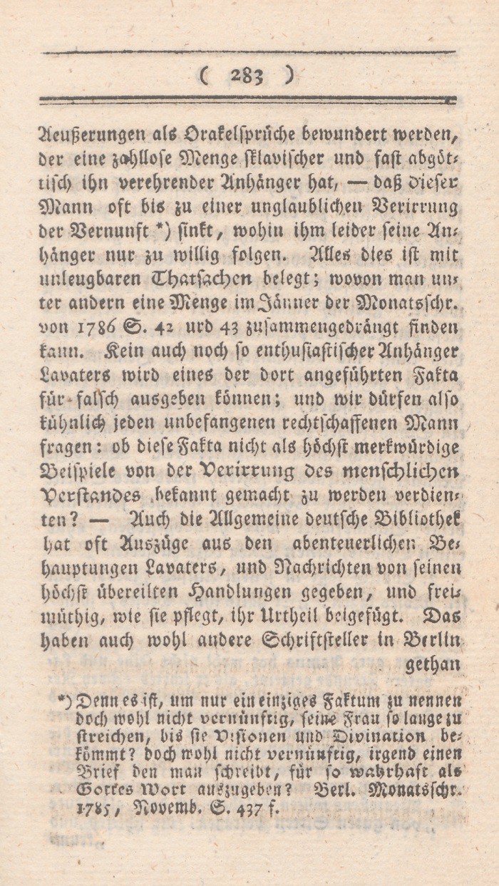 Aeußerungen als Orakelsprüche bewundert werden, der eine zahlllose Menge sklavischer und fast abgöttisch ihn verehrender Anhänger hat, – daß dieser Mann oft bis zu einer unglaublichen Verirrung der Vernunft *) sinkt, wohin ihm leider seine Anhänger nur zu willig folgen. Alles dies ist mit unleugbaren Thatsachen belegt; wovon man unter andern eine Menge im Jänner der Monatsschr. von 1786 S. 42 und 43 zusammengedrängt finden kann. Kein auch noch so enthusiastischer Anhänger Lavaters wird eines der dort angeführten Fakta für falsch ausgeben können; und wir dürfen also kühnlich jeden unbefangenen rechtschaffenen Mann fragen: ob diese Fakta nicht als höchst merkwürdige Beispiele von der Verirrung des menschlichen Verstandes bekannt gemacht zu werden verdienten? – Auch die Allgemeine deutsche Bibliothek hat oft Auszüge aus den abenteuerlichen Behauptungen Lavaters, und Nachrichten von seinen höchst übereilten Handlungen gegeben, und freimüthig, wie sie pflegt, ihr Urtheil beigefügt. Das haben auch wohl andere Schriftsteller in Berlin