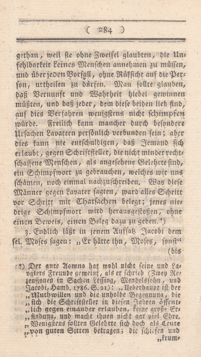 *) Der gute Asmns (?) hat wohl nicht seine und Lavaters Freunde gemeint, als er schrieb (Zwey Rezensionen in Sachen Lessing, Mendelssohn, und Jacobi, Hamb. 1786. S. 21): „Ueberhaupt ist der Muthwillen und die unholde Begegnung, die sich die Schriftsteller in diesen Jahren öffentlich gegen einander erlauben, keine große Erfindung, und macht ihnen nicht gar viel Ehre. Wenigstens sollten Gelehrte sich doch als Leute von guten Sitten betragen; die schiefen und krummen Urtheile sind nicht immer in ihrer Macht, weil sie auch urtheilen, was sie nicht verstehen. Man sollte freilich fast sagen, es wäre auch besser, wenn sie mit solchen Urtheilen zu Hause blieben; aber sie haben nicht immer die Zeit, sich vorher an fait zu setzen, u.s.w. „ – Es paßt ganz vortreflich zum vorliegenden Falle.