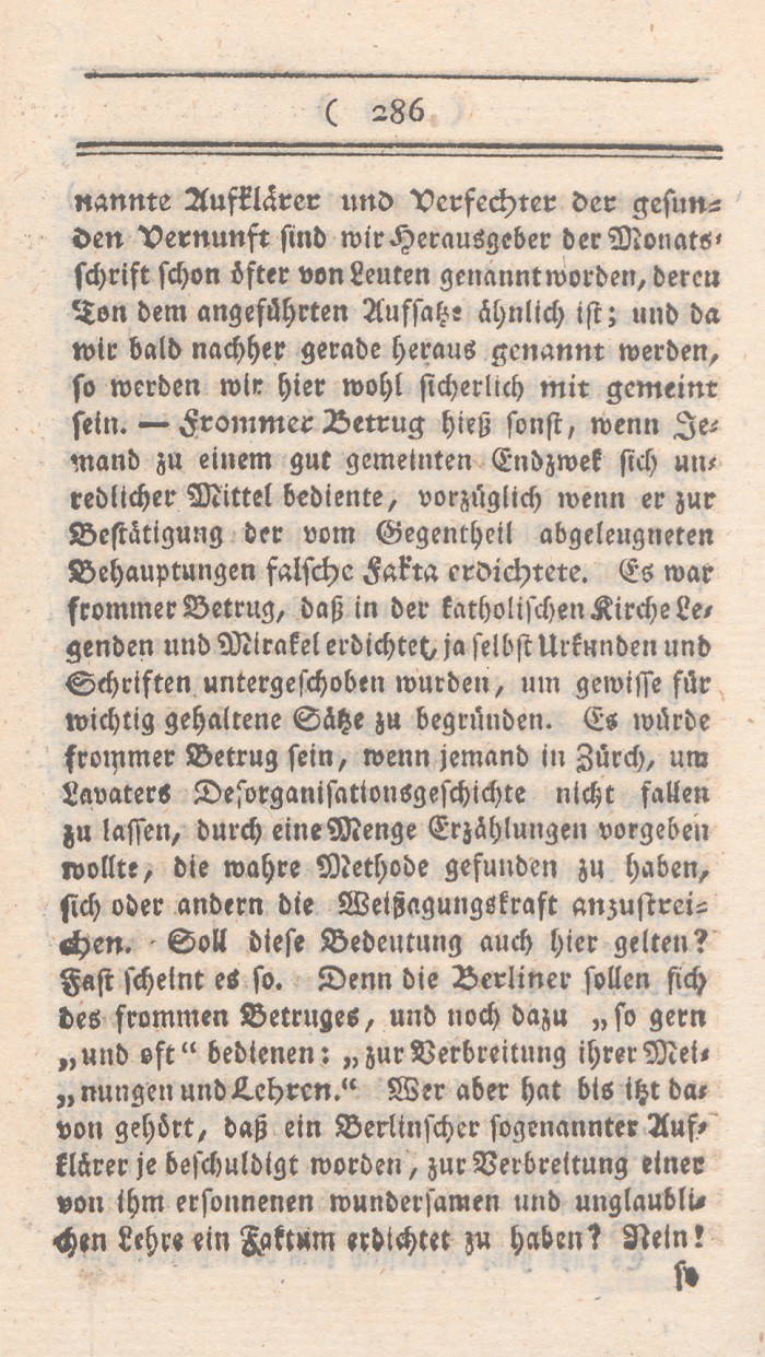 nannte Aufklärer und Verfechter der gesunden Vernunft sind wir Herausgeber der Monatsschrift schon öfter von Leuten genannt worden, deren Ton dem angeführten Aufsatze ähnlich ist; und da wir bald nachher gerade heraus genannt werden, so werden wir hier wohl sicherlich mit gemeint sein. – Frommer Betrug heißt hier sonst, wenn Jemand zu einem gut gemeinten Endzwek sich unredlicher Mittel bediente, vorzüglich wenn er zur Bestätigung der vom Gegenteil abgeleugneten Behauptungen falsche Fakta erdichtete. Es war frommer Betrug, daß in der katholischen Kirche Legenden und Mirakel erdichtet, ja selbst Urkunden und Schriften untergeschoben wurden, um gewisse für wichtig gehaltene Sätze zu begründen. Es würde frommer Betrug sein, wenn jemand in Zürch, um Lavaters Desorganisationsgeschichte nicht fallen zu lassen, durch eine Menge Erzählungen vorgeben wollte, die wahre Methode gefunden zu haben, sich oder andern die Weißagungskraft anzustreichen. Soll diese Bedeutung auch hier gelten? Fast scheint es so. Denn die Berliner sollen sich des frommen Betruges, und noch dazu „so gern und oft“ bedienen: „zur Verbreitung ihrer Meinungen und Lehren“. Wer aber hat bis itzt davon gehört, daß ein Berlinscher sogenannter Aufklärer je beschuldigt worden, zur Vorbereitung einer von ihm ersonnenen wundersamen und unglaublichen Lehre ein Faktum erdichtet zu haben? Nein!