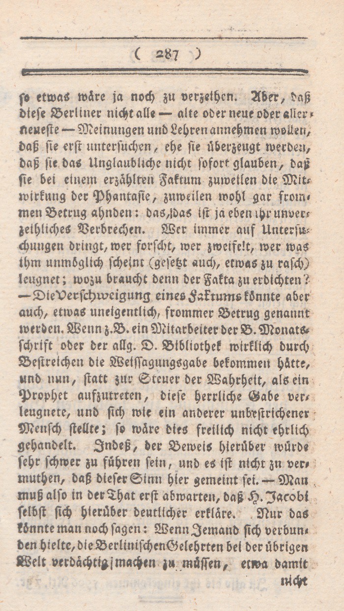 so etwas wäre ja noch zu verzeihen. Aber, daß diese Berliner nicht alle – alte oder neue oder allerneueste – Meinungen und Lehren annehmen wollen, daß sie erst untersuchen, ehe sie überzeugt werden, daß sie das Unglaubliche nicht sofort glauben, daß sie bei einem erzählten Faktum zuweilen die Mitwirkung der Phantasie, zuweilen wohl gar frommen Betrug ahnden: das ist ja eben ihr unverzeihliches Verbrechen. Wer immer auf Untersuchungen dringt, wer forscht, wer zweifelt, wer was ihm unmöglich scheint (gesetzt auch, etwas zu rasch) leugnet; wozu braucht denn der Fakta zu erdichten? – Die Verschweigung eines Faktums könnte aber auch, etwas uneigentlich, frommer Betrug genannt werden. Wenn z.B. ein Mitarbeiter der B. Monatsschrift oder der allg. D. Bibliothek wirklich durch Bestreichen die Weissagungsgabe bekommen hätte, und nun, statt zur Steuer der Wahrheit, als ein Prophet aufzutreten, diese herrliche Gabe berleugnete, und sich wie ein anderer unbestrichener Mensch stellte; so wäre dies freilich nicht ehrlich gehandelt. Indeß, der Beweis hierüber würde sehr schwer zu führen sein, und es ist nicht zu vermuthen, daß dieser Sinn hier gemeint sei. – Man muß also in der That erst abwarten, daß H. Jacobi selbst sich hierüber deutlicher erkläre. Nur das könnte man noch sagen: Wenn Jemand sich verbunden hielte, die Berlinischen Gelehrten bei der übrigen Welt verdächtig machen zu müssen, etwa damit