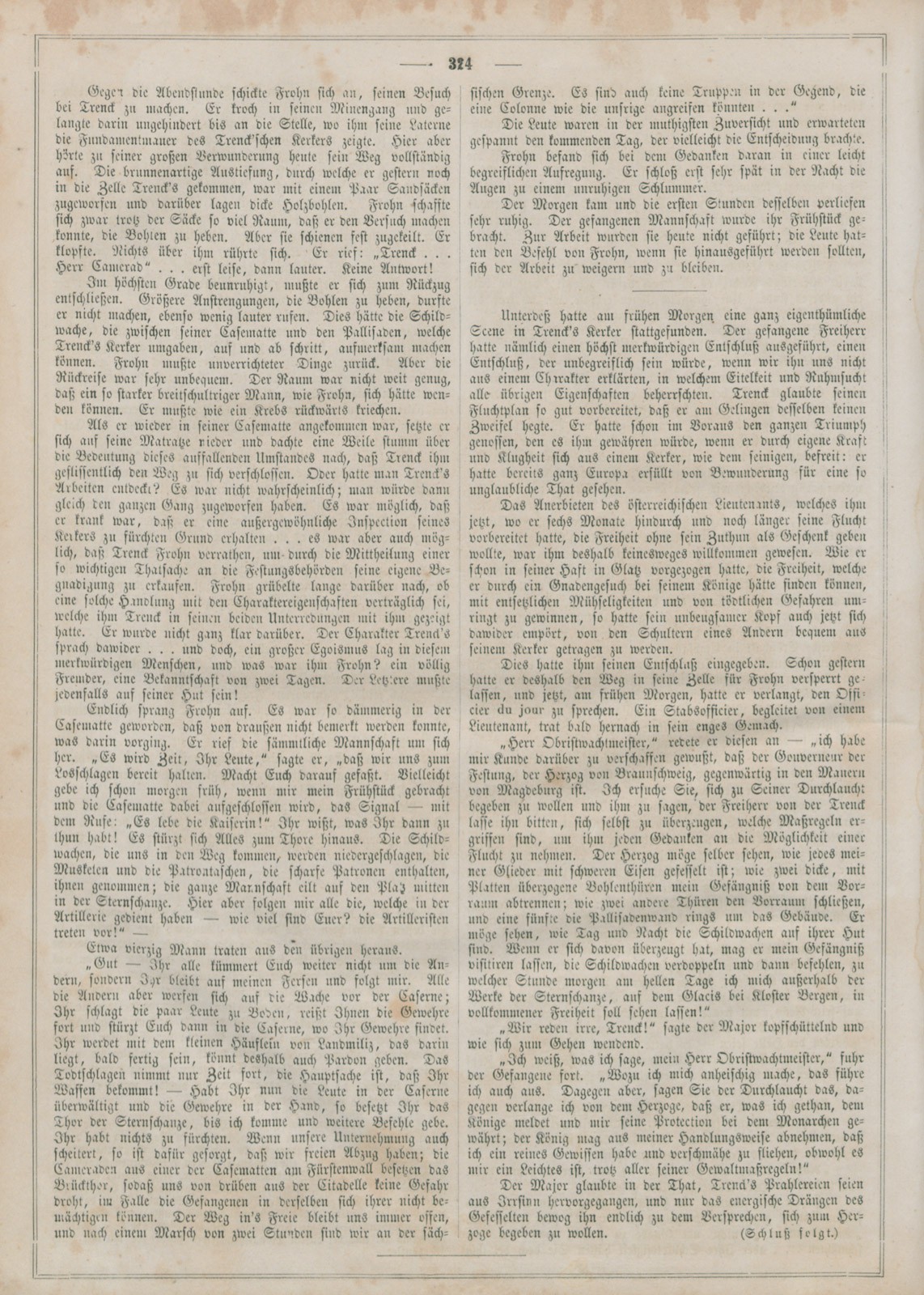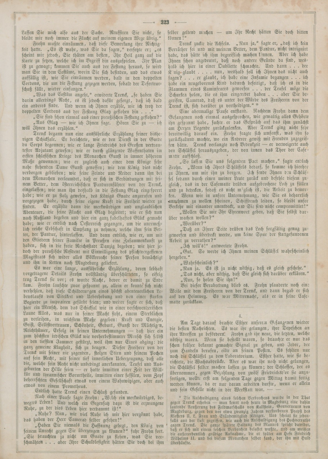 „Was das Costüm angeht,“ erwiderte Trenck, „so haben Sie darin allerdings Recht, es ist jedoch dafür gesorgt, daß ich bald ein anderes finde. Und wenn ich Ihnen erzähle, wie ich trotz der doppelten Cordons aus der Festung Glatz geflohen bin …“
