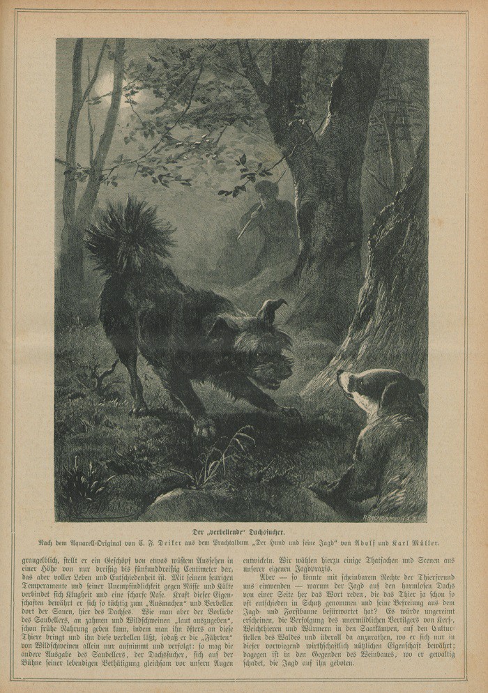 Leibhaftig und fesselnd präsentirt sich auf unserm Bilde der rauhe, derbe Bündel Dachssucher, wie er den „Grimmbart“, diesen beliebten, mysteriösen Gegenstand der Nachtjagden jugendlicher Waidmannsgemüther gefunden, „gestellt“ hat und „verbellt“. Es ist der untrügliche, wackere Hund im Grunde derselbe, der als sogenannter „Saubeller“ zum Auffinden der Wildsauen gebraucht wird. Hier figurirt er als „ Dachssucher“. Er ist ein echter Abkömmling seiner beiden vorzüglichsten Ahnen, des Schäferhundes und des diesen in sicherem Finden noch übertreffenden eisgrauen Spitzpommers stärkerer Rasse. Der Mangel an Flüchtigkeit des letzteren in der Verfolgung des Wildes führte zur Kreuzung zwischen Pommer und Schäferhund oder zwischen rauhhaarigem Pinscher und Pommer. Meist trüb und dunkel gefärbt, entweder eisgrau, schwarz mit dunkelgelben Abzeichen, sowie