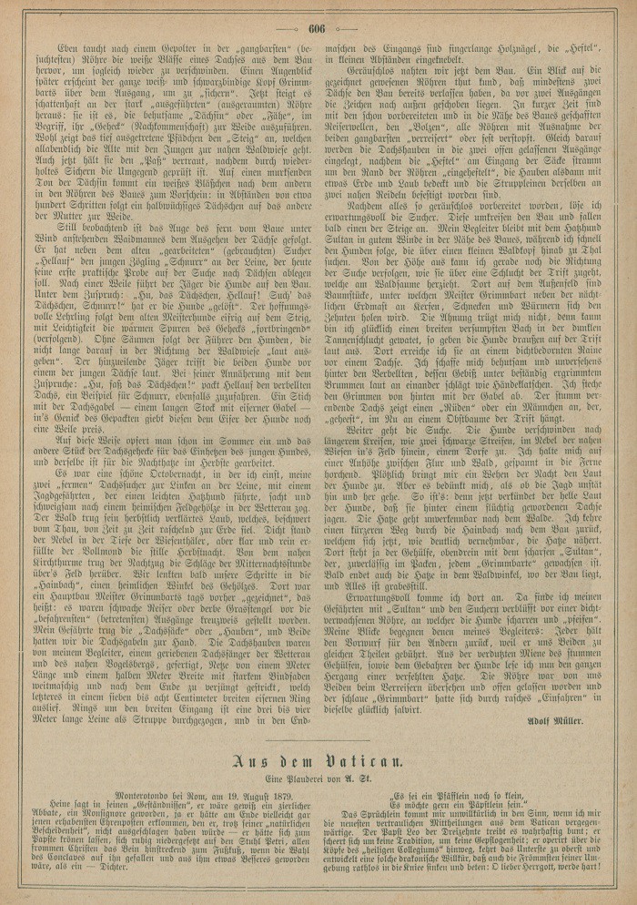 Es war eine schöne Octobernacht, in der ich einst, meine zwei „fermen“ Dachssucher zur Linken an der Leine, mit einem Jagdgefährten, der einen leichten Hatzhund führte, sacht und schweigsam nach einem heimischen Feldgehölze in der Wetterau zog. Der Wald trug sein herbstlich verklärtes Laub, welches, beschwert vom Thau, von Zeit zu Zeit raschelnd zur Erde fiel. Dicht stand der Nebel in der Tiefe der Wiesenthäler, aber klar und rein erfüllte der Vollmond die stille Herbstnacht. Von dem nahen Kirchthurme trug der Nachtzug die Schläge der Mitternachsstunde über’s Feld herüber. Wir lenkten bald unsere Schritte in die „Hainbach“, einen heimlichen Winkel des Gehölzes. Dort war ein Hauptbau Meister Grimmbarts tags vorher „gezeichnet“, das heißt: es waren schwache Reiser oder derbe Grasstengel vor die „befahrensten“ (betretensten) Ausgänge kreuzweis gestellt worden. Mein Gefährte trug die „Dachssäcke“ oder „Hauben“, und Beide hatten wir die Dachsgabeln zur Hand. Die Dachshauben waren von meinem Begleiter, einem geriebenen Dachsfänger der Wetterau und des nahen Vogelbergs, gefertigt, Netze von einem Meter Länge und einem halben Meter Breite mit starkem Bindfaden weitmaschig und nach dem Ende zu verjüngt gestrickt, welch letzteres in einem sieben bis acht Centimeter breiten eisernen Ring auslief. Rings um den breiten Eingang ist eine drei bis vier Meter lange Leine als Struppe durchgezogen, und in den Endmaschen des Eingangs sind fingerlange Holznägel, die „Heftel“, in kleinen Abständen eingeknebelt.
