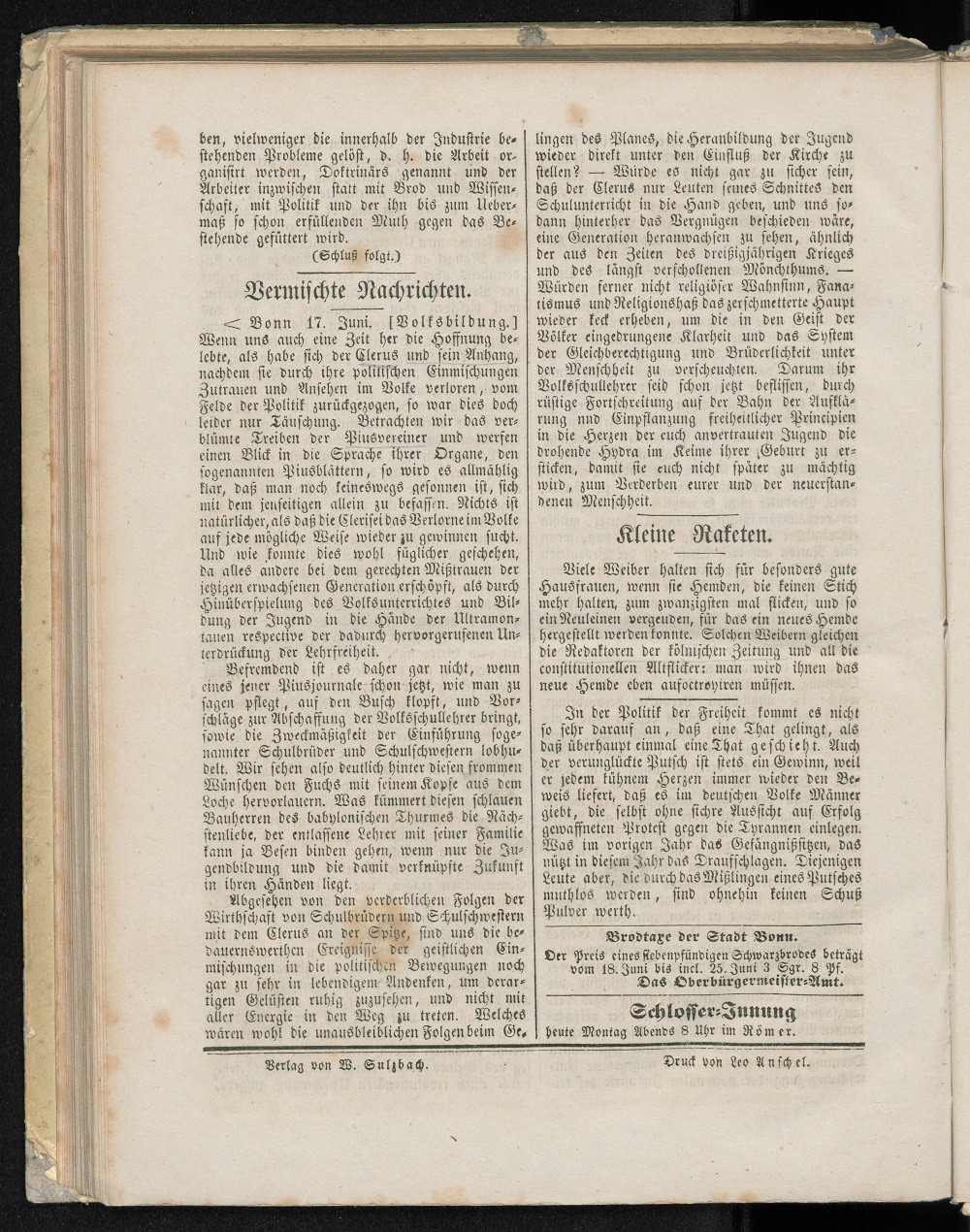 Der Preis eines siebenpfündigen Schwarzbrot beträgt vom 18. Juni bis incl. 25. Juni 3 Sgr. 8 Pf.