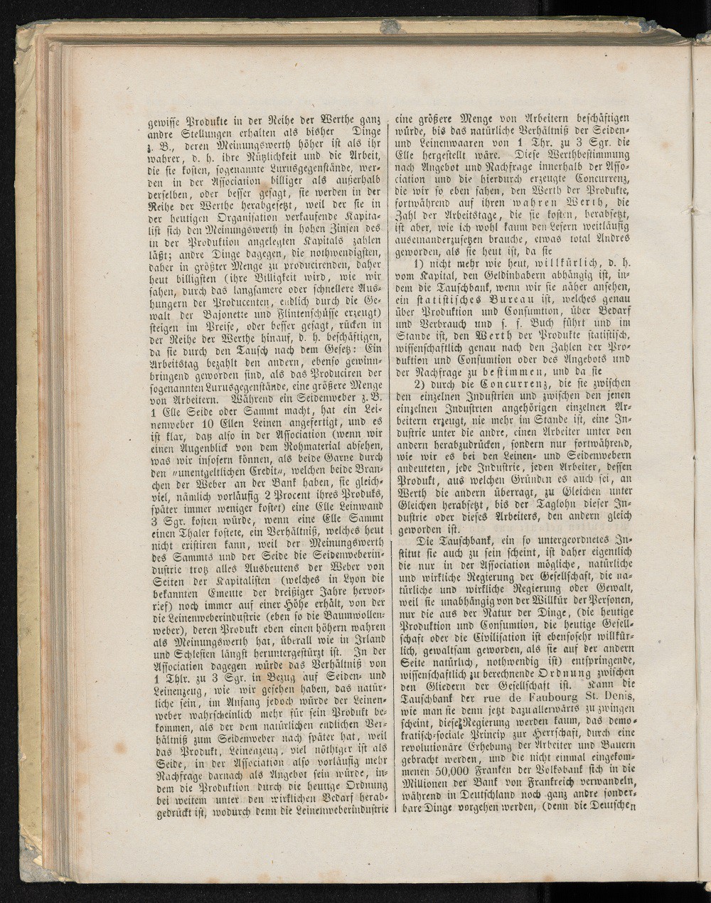 Es bliebe mir zur Vervollständigung, des in meinen Briefen Dargestellten noch übrig, zu zeigen, daß die Association, das Prinzip der Tauschbank zwischen den Völkern nichts anderes ist, als der von einigen deutschen Regierungen vor einem Jahrzehend unter sich eingeführte Zollverein, (Differenzialzoll nach innen, Schutzzoll nach außen), und endlichwie die Association des Grundelements aller Producenten, der Bauern, (gleichviel ob heut sogenannte Eigenthümer oder Pächter) sich in sich und den associirten Industrien gegenüber nach dem Prinzip der Tauschbank gestaltet, ich will dies aber nur in weiteren Briefen ergänzen, wenn Sie und Ihre Leser mit dem vorhergegangenen einverstanden und zufrieden, das Weitere von mir verlangen.