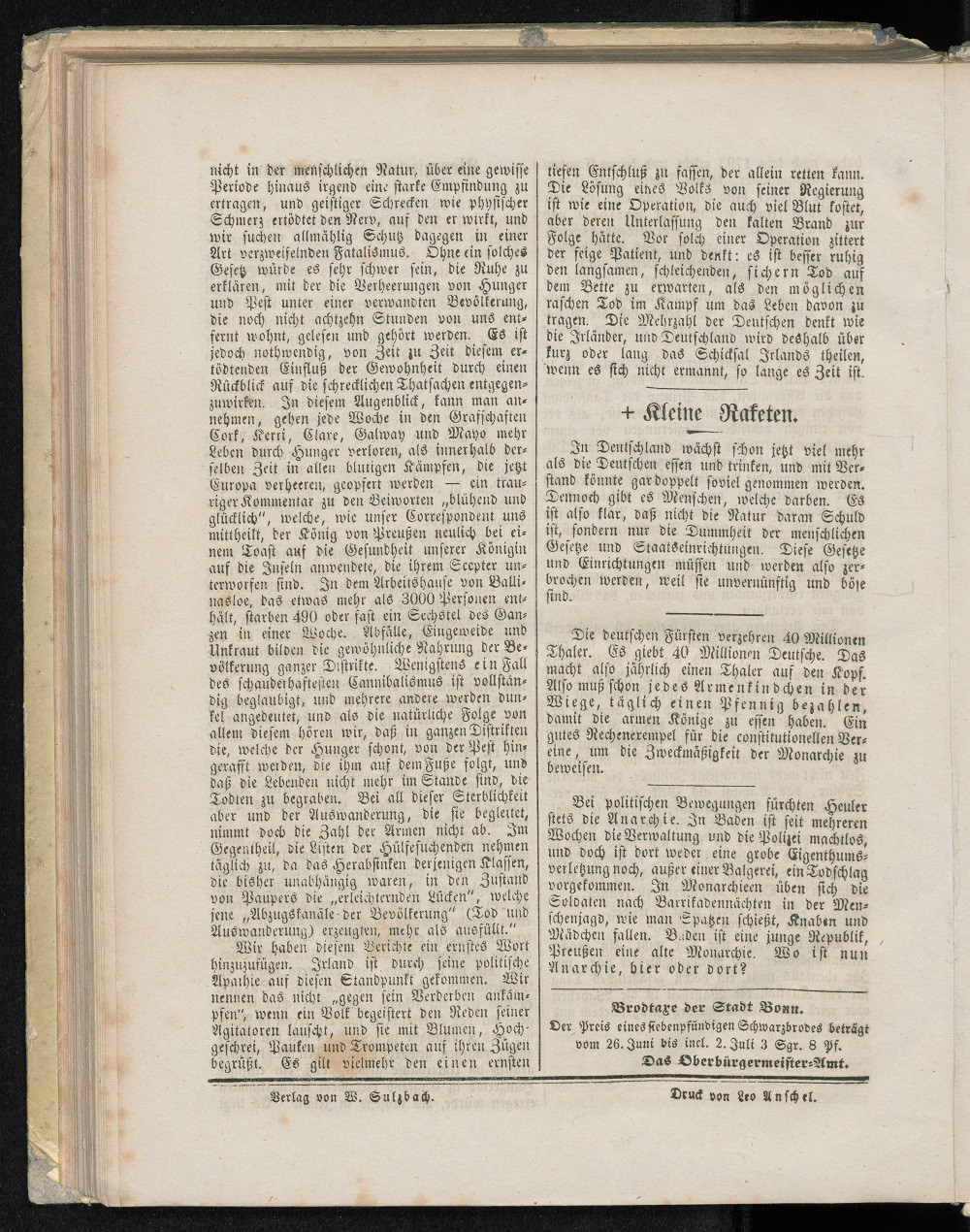 „In Voltaire´s Stéele de Louis XIV. findet man folgende Beschreibung der Umstände, welche die sich in die Länge ziehende Belagerung von Lille begleiteten: Die Bewohner von Lille wurden an den Donner der Kanonen und allen Schrecken eines Bombardements so gewöhnt, daß die Theatervorstellungen ebenso zahlreich besucht werden, als in Friedenszeiten, und man selbst durch Bomben, die in der Nähe des Theaters fielen, die Vorstellungen nicht unterbrechen ließ. So geht es uns jetzt mit Irland. Wir sind schon so gewöhnt von Sterblichkeit und Bankerott in Munster und Konnaught zu lesen, daß wir fast gleichgültig dagegen geworden sind. Mit Recht wurde neulich im Unterhause gesagt, daß ein einziger Hungertod in England viel mehr Aufmerksamkeit erregen würde, als tausend in Irland. Es liegt ...