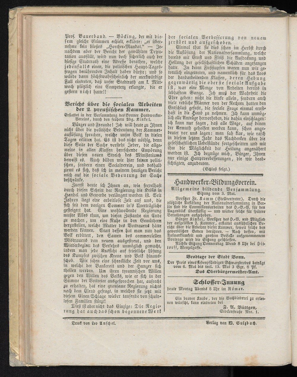 Erstattet in der Versammlung des Bonner Handwerker = Vereins, durch den frühern Abg. Kinkel.
