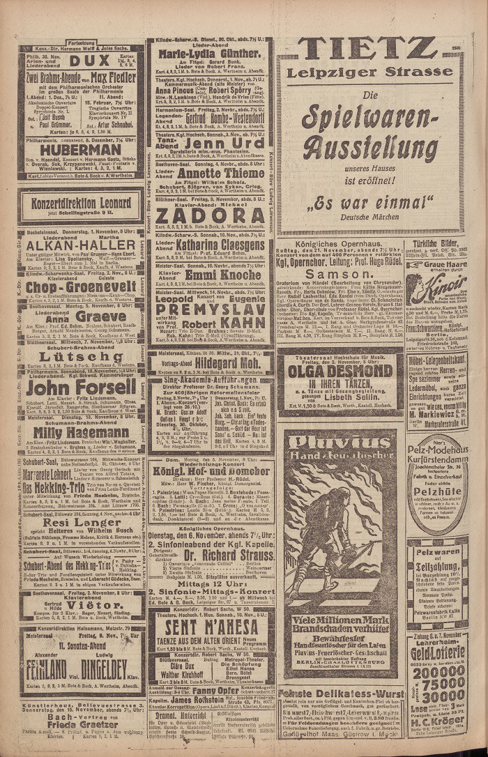 Die Erstaufführung von Korngolds „Violanta“ und „Ring des Polykrates“ findet im Königlichen Opernhaus am 2. November statt. In „Violanta“ sind in den Hauptrollen die Damen Hasgren-Waag, Goetze und die Herren Hutt und Armster, im „Ring des Polykrates“ die Damen Dux, Engell und die Herren Bergman, Henke und Stock beschäftigt. Musikalische Leitung: Generalmusikdirektor Blech, Regie: Dr. Bruck. Der Komponist ist eingetroffen und wird der Erstaufführung beiwohnen.