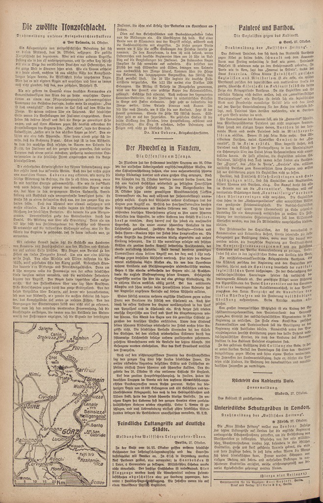 Italienischer Heeresbericht vom 26. Oktober: Die feindliche Offensive gegen den linken Flügel unserer Truppen an der Julischen Front, die durch mächtige Massen von Feinden genährt wurde, hielt in der Nacht zum 25. und den gestrigen Tag über mit äußerster Heftigkeit an. Vom Monte Maggiore bis westlich von Auzza mußten wir aus unserer äußersten Linie weichen, und infolge dieses Zurückgehens mußten wir zur Räumung der Hochfläche von Baisizza schreiten. Oestlich von Görz und auf dem Karst ist die Lage unverändert. Gestern wurden 10 feindliche Flugzeuge abgeschossen oder von unseren Fliegern gezwungen zu landen.